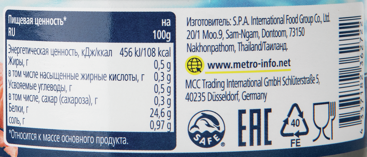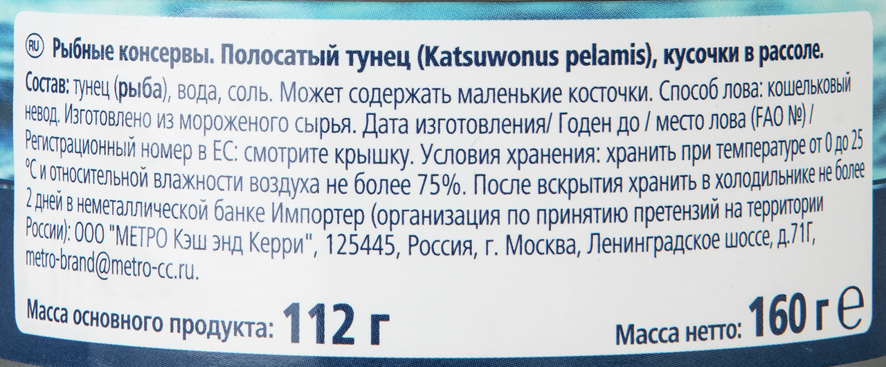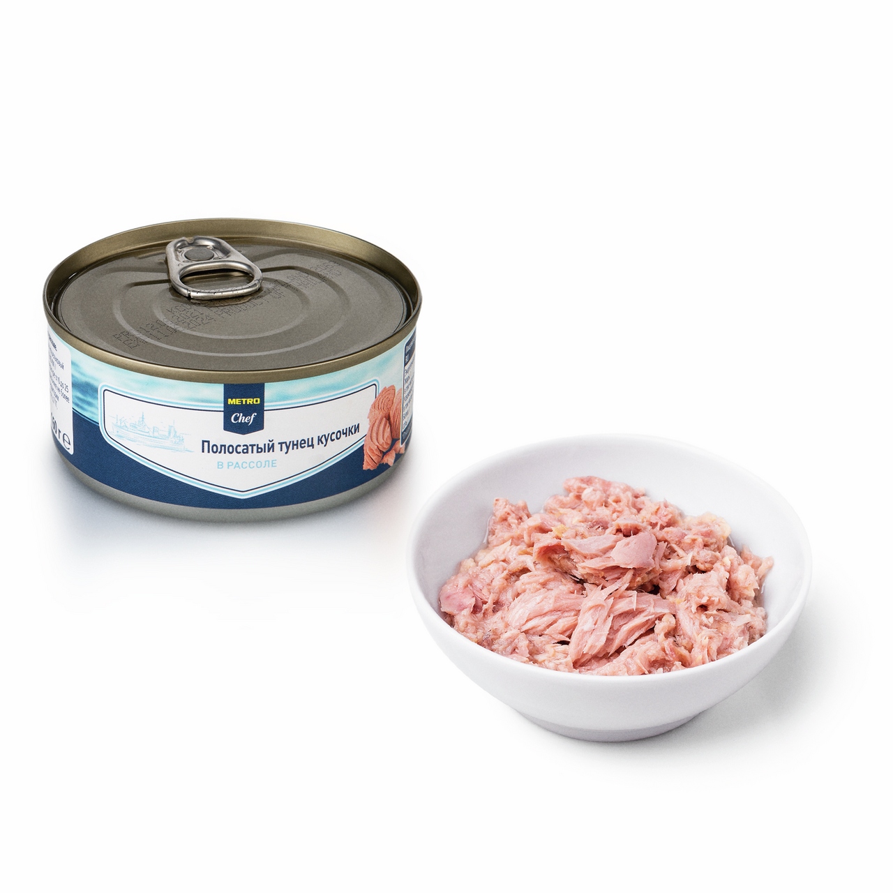 Тунец Metro Chef кусочки в рассоле 160г — сытный и полезный продукт, уже готовый к употреблению. Тунец универсален: его можно есть просто так, подавать с гарниром, добавлять в салаты, готовить с ним сэндвичи. Продукт в рассоле, без масла, а значит, подходит для тех, кто ограничивает количество жира в рационе. Кроме того, у тунца низкая калорийность, поэтому у него найдутся поклонники и среди тех, кто тщательно следит за своим весом. Тунец богат белком, различными минералами, а также полезными жирными кислотами омега-3. Также он содержит фосфор, витамины группы В, а также витамин А.