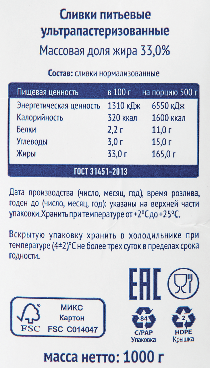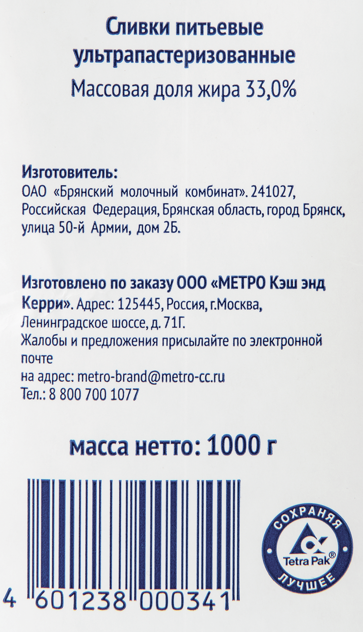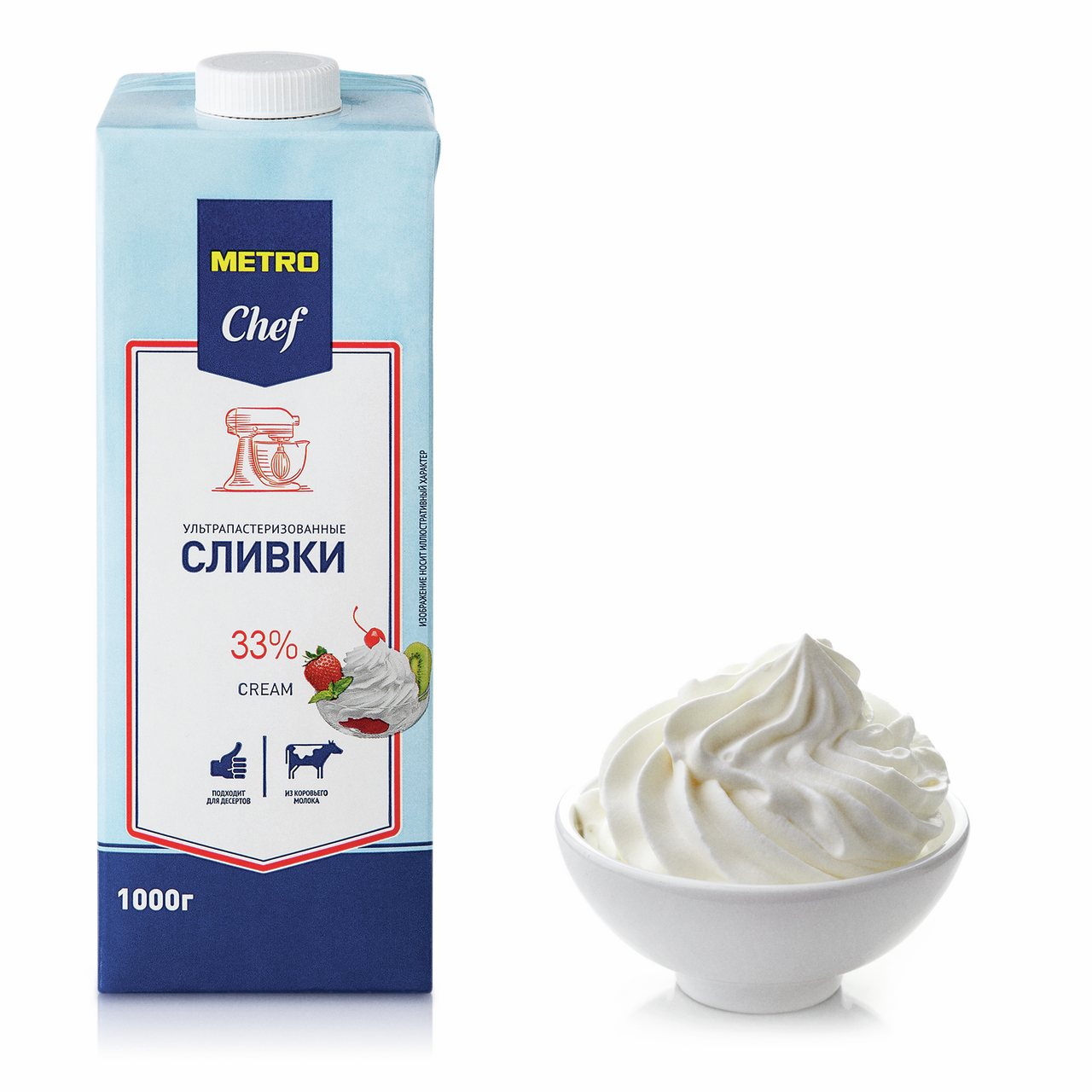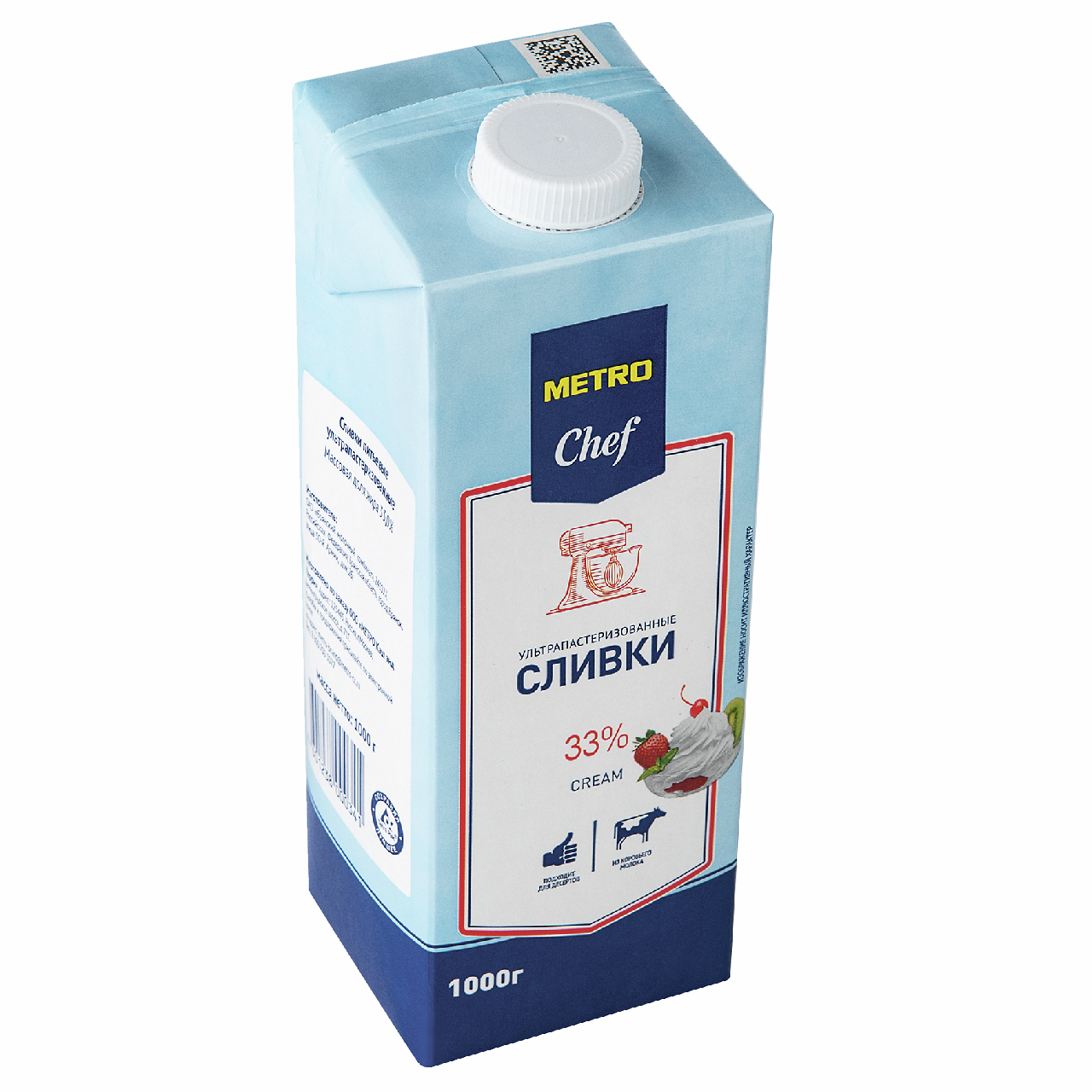 Metro Chef Сливки ультрапастеризованные 33% ТВА 1000г – это нежные сливки, предназначенные для взбивания, изготовленные по традиционному итальянскому рецепту из коровьего молока. Продукт обладает отличным вкусовыми и питательными качествами, не содержат консервантов, приятной консистенцией, выраженным сливочным вкусом и ароматом. Сливки очень легко взбиваются и отлично держат форму, не расслаиваются и не растекаются. Именно поэтому они станут прекрасным дополнением различных десертов, в том числе тортов и пирожных, основой для сложных кремов, муссов.