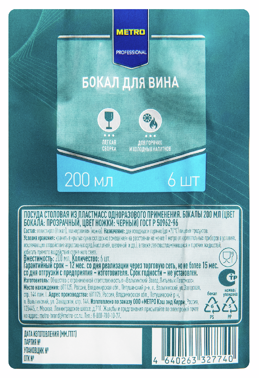 Одноразовый пластиковый бокал для вина объёмом 200мл - это элегантное и практичное решение для сервировки напитков в сфере общественного питания. Прозрачная чаша подчёркивает цвет и прозрачность вина, а чёрная ножка добавляет стиль и изысканность в подачу. Бокал изготовлен из безопасного полистирола, соответствующего санитарным нормам и стандартам экологичности. Прочный материал обеспечивает устойчивость к деформации, а конструкция бокала удобна в использовании и не теряет эстетичный вид даже при активной эксплуатации. Благодаря удобной форме бокал надёжно стоит на поверхности и позволяет комфортно держать его в руке. Лёгкость и компактность делают его незаменимым для банкетов, фуршетов, кейтеринга, корпоративных мероприятий и праздничных вечеринок. Идеальное решение для кафе, ресторанов, баров и выездного обслуживания - сочетание практичности, эстетики и безопасности.
