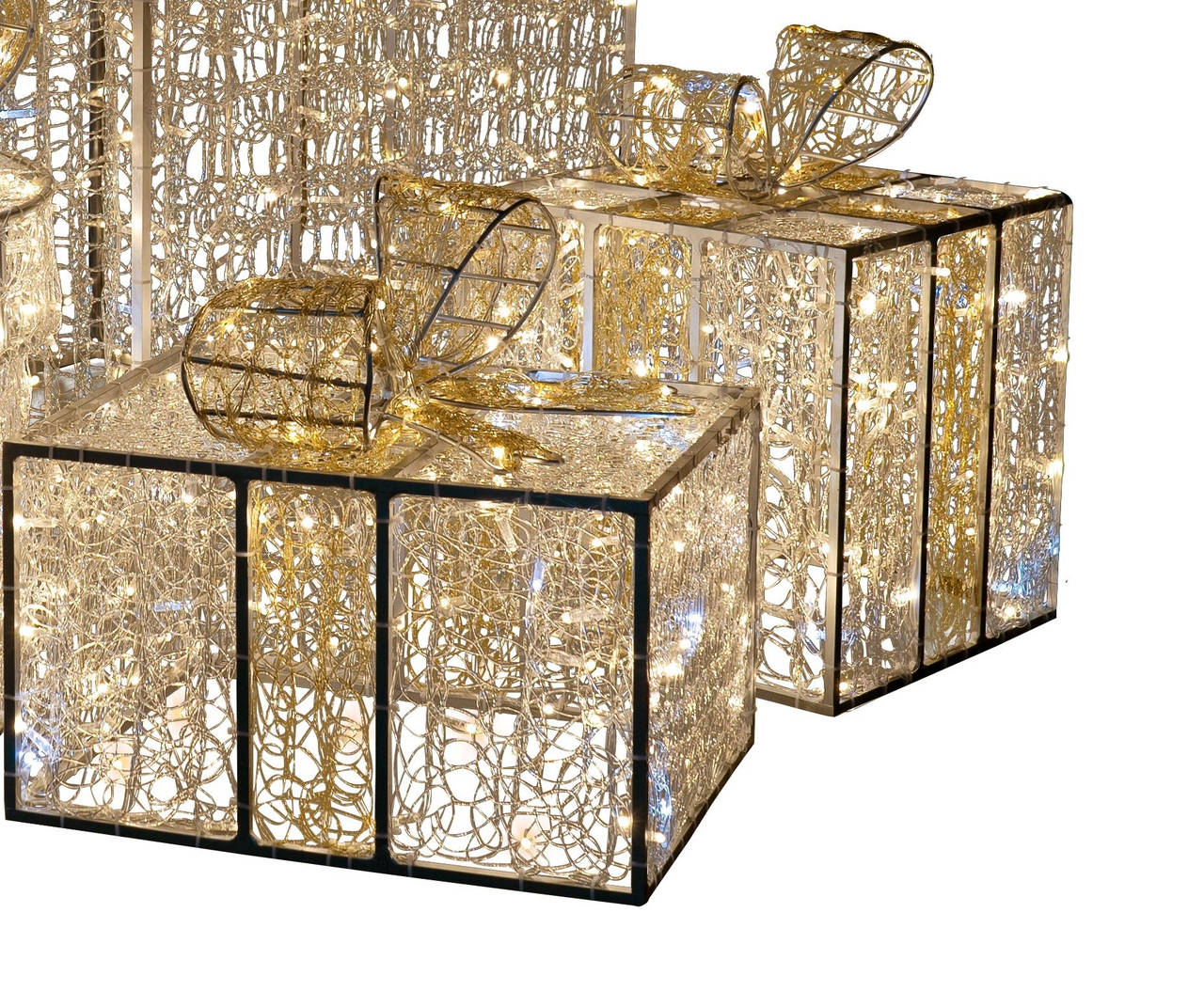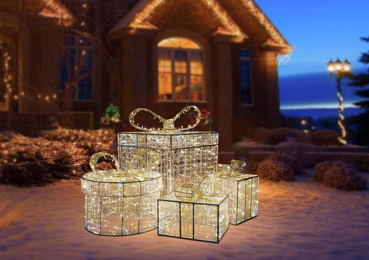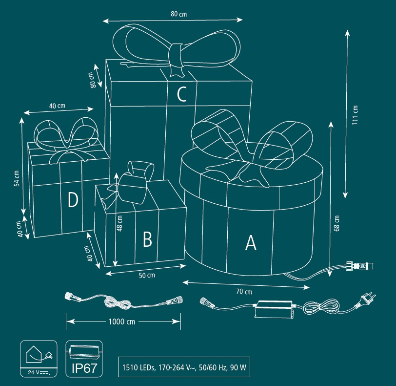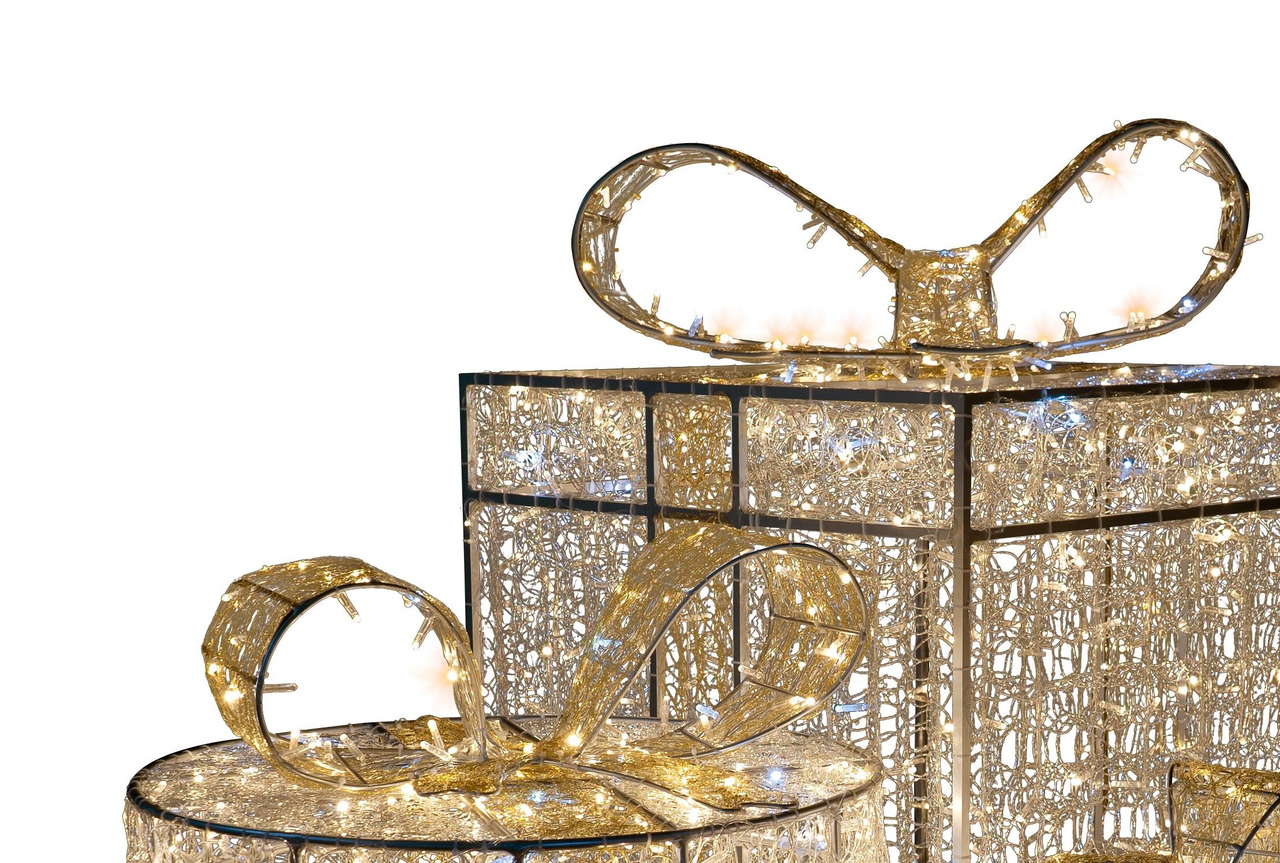 Великолепная световая композиция из четырех праздничных коробок-подарков высотой до 117 см создаст эффектный акцент в вашем уличном декоре. Композиция объединяет 1510 светодиодов в теплой белой гамме с динамическим эффектом — 10% ледяных белых ламп создают изящное мерцание, напоминающее переливы упаковочной бумаги. Прочная алюминиевая рама с ПВХ-элементами и двойной защитой (IP44 для продукта, IP67 для трансформатора) гарантирует бесперебойную работу в любых погодных условиях. Длинный кабель питания 10 метров и безопасное напряжение 24В обеспечивают удобное размещение даже на большом расстоянии от розетки. Мощность 90 Вт создает яркое насыщенное свечение, а продуманная разборная конструкция облегчает транспортировку и хранение. Солидный вес 21.2 кг обеспечивает устойчивость композиции, делая ее идеальным решением для парадных входов, площадей и коммерческих пространств.