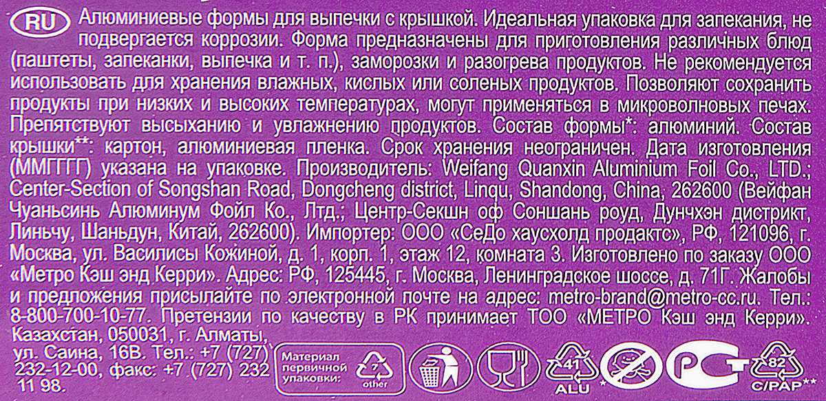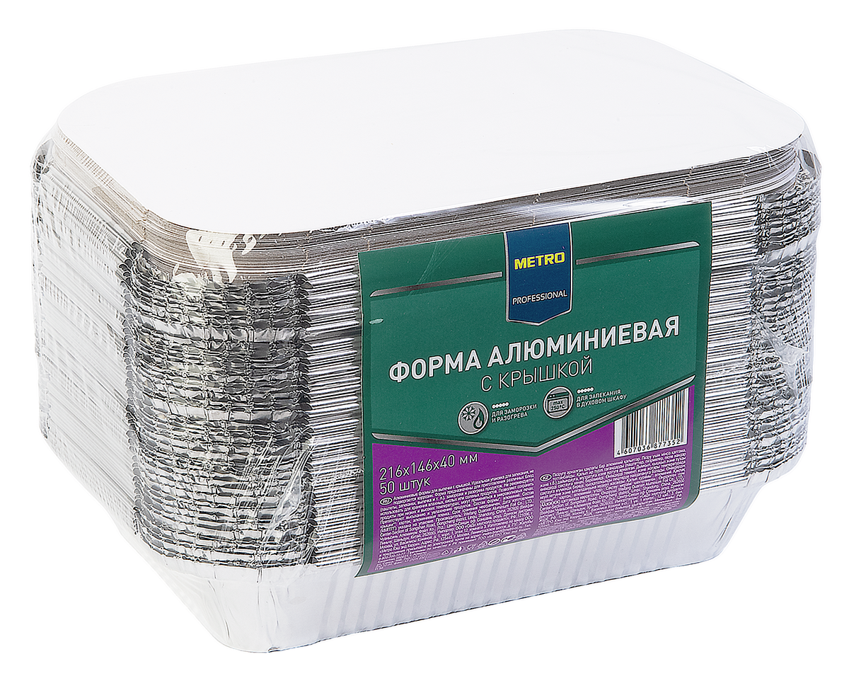 METRO PROFESSIONAL Формы алюминиевые с крышкой, 216х146х40 мм, 50 шт. — жаропрочная форма с удобными бортиками, которая хорошо подойдет для приготовления различных блюд. К материалу продукты не прилипают, и готовое кушанье легко извлекается. Изделие можно использовать в газовых и электрических духовых шкафах, морозильных камерах. Формы также подходят для хранения и заморозки продуктов, приготовления желе или холодца. Каждая формочка оснащается практичной крышкой. Накрывать крышку следует фольгированной стороной внутрь, что поможет продлить температурный режим продуктов, сохранит их свежесть. Крышка плотно прилегает к контейнеру, защищая его содержимое от проникновения влаги, пыли, посторонних частиц. Алюминий не вступает в реакции с продуктами и является безопасным материалом для здоровья человека.