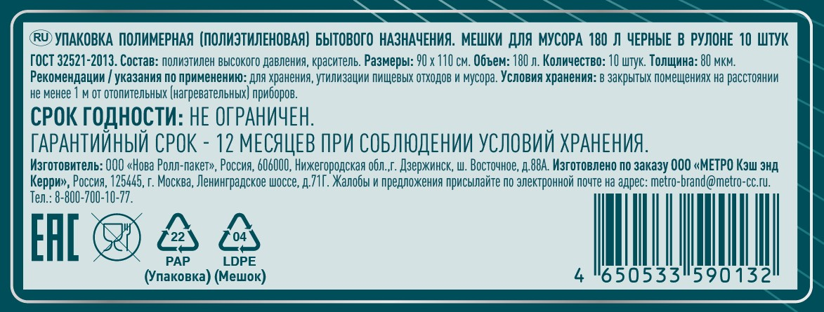 METRO PROFESSIONAL Мешки для мусора 80мкм 10шт, 180л