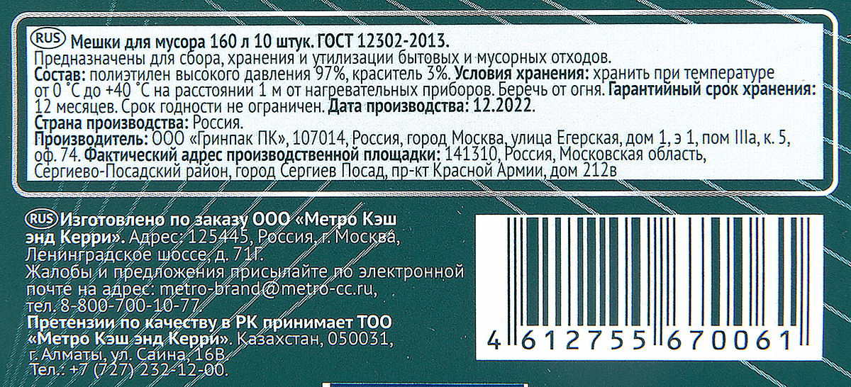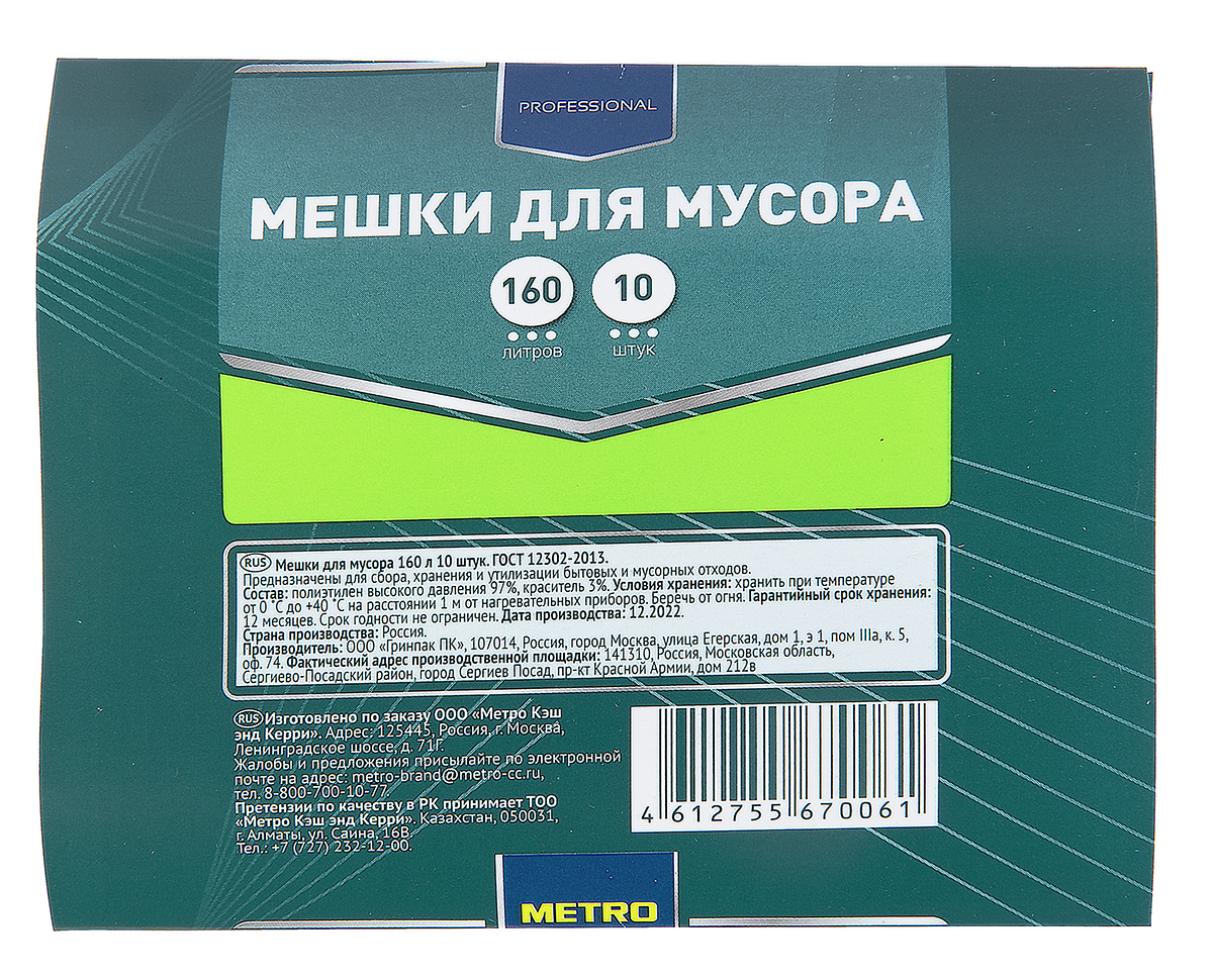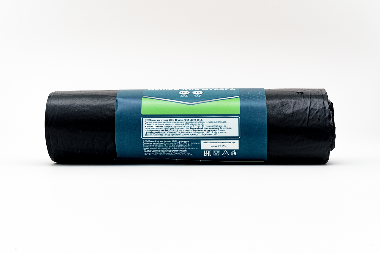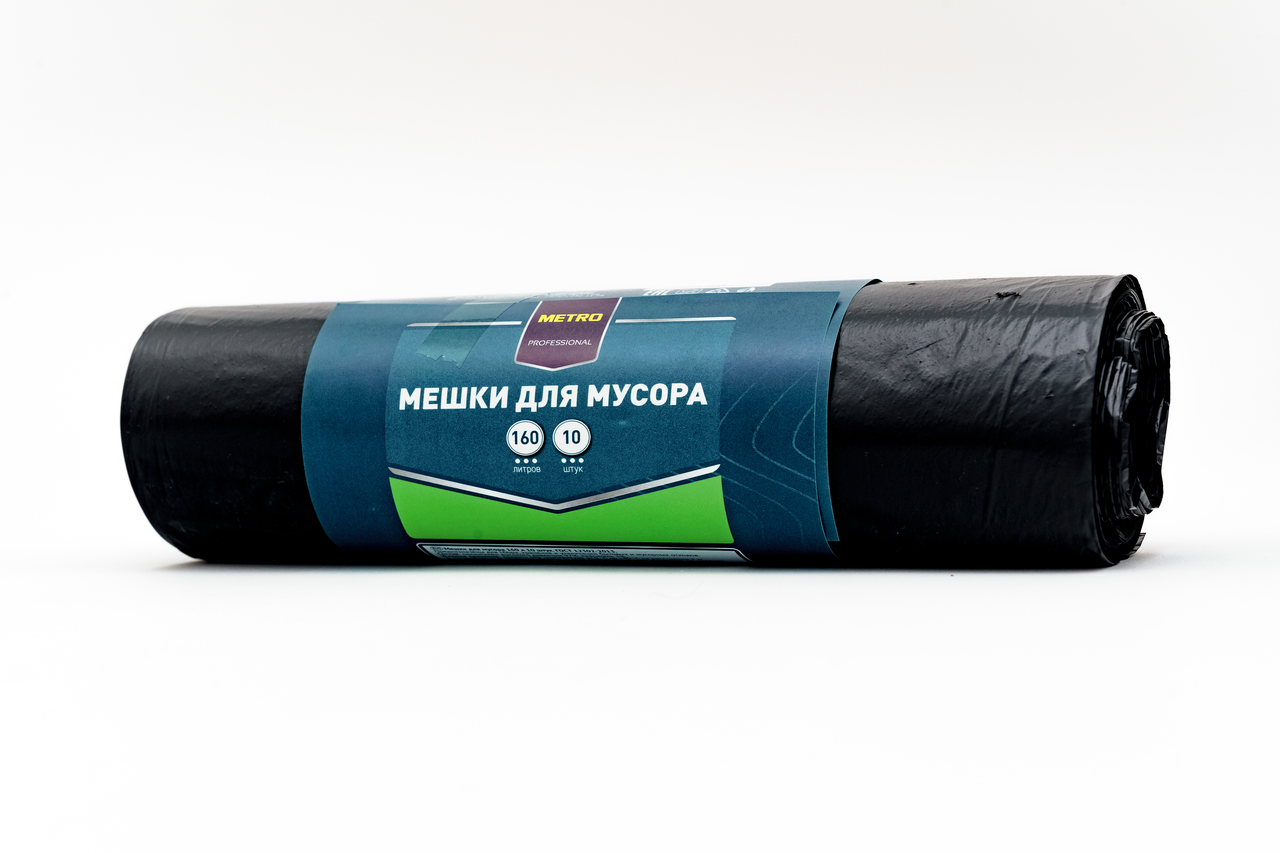 METRO PROFESSIONAL Мешки для мусора без тесемок, 160 л, 10 шт. представляют собой одноразовые изделия. Ими застилают урны соответствующего размера. В них можно складывать бытовой мусор и пищевые отходы. Мусорные мешки большого объема способны выдерживать значительный вес. Их изготавливают из прочного полиэтилена. Этот материал полностью безопасен для человека. Мешки для мусора поставляются в рулонах. Изделия отделены друг от друга с помощью перфорации. Достаточно небольшого усилия, чтобы отделить один или несколько пакетов от рулона, при этом кромки не повреждаются. Мусорные мешки не имеют срока годности. Для их сохранности следует соблюдать правила, указанные производителем на упаковке. Недопустимо хранить полиэтиленовые пакеты вблизи нагревательных приборов. Не следует оставлять их под прямыми солнечными лучами (на балконах, подоконниках и в других местах) или в помещениях с температурой выше 400С.