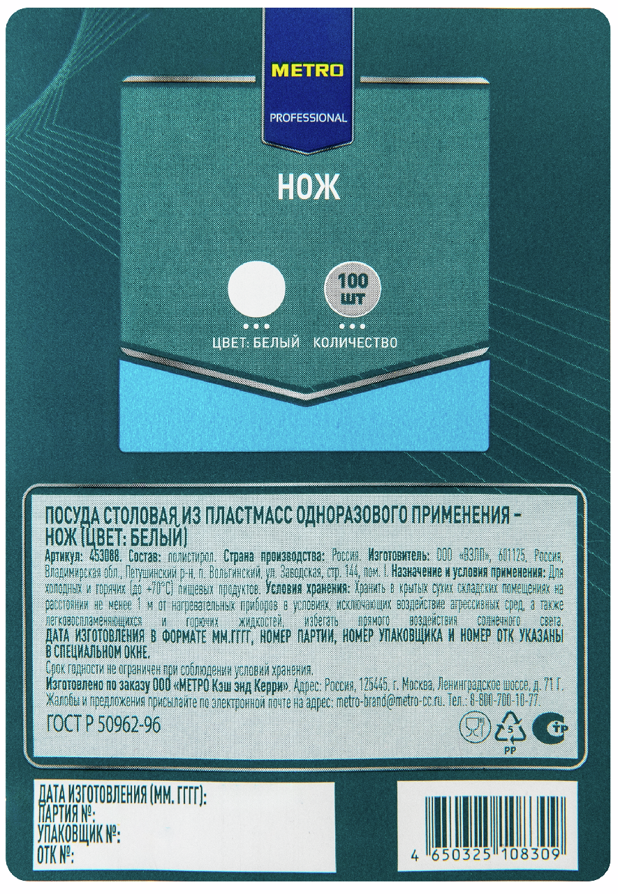 METRO PROFESSIONAL Нож одноразовый из полистирола белый 16.5, 100шт