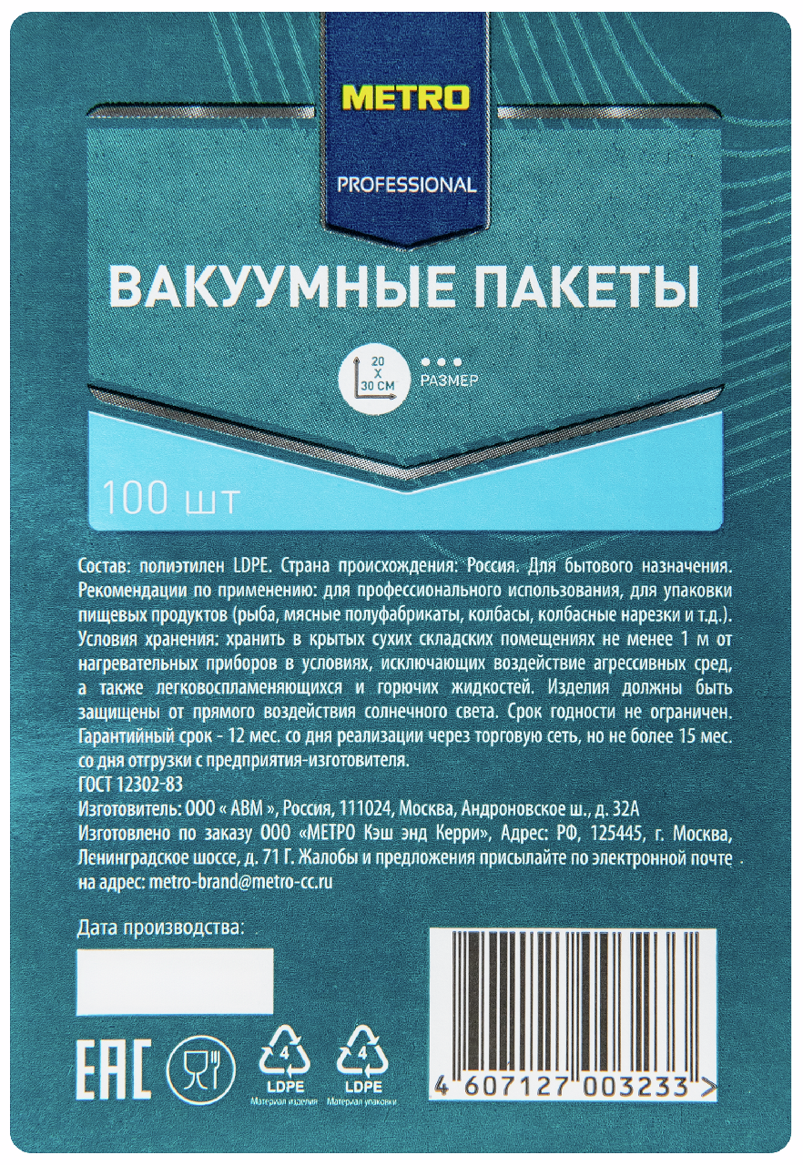 METRO PROFESSIONAL Пакеты вакуумные 20х30 см, 100 шт. — это незаменимый предмет для сохранения свежести и долговечности продуктов. Они предназначены для использования с вакууматором и обеспечивают максимально герметичное покрытие, защищая продукты от негативного влияния внешней среды. Основные преимущества вакуумных пакетов METRO PROFESSIONAL: — Долговечность и надежность. Пакеты изготовлены из высококачественного материала, очень прочного и долговечного. — Сохранение свежести. Упаковка дает возможность сохранить свежесть продуктов, предотвращая окисление и гниение. Благодаря герметичной упаковке, продукты остаются свежими и вкусными в течение длительного времени. — Защита от воздуха и влаги. Пакеты обеспечивают герметичное покрытие, которое защищает продукты от воздуха и влаги. Это предотвращает рост бактерий и позволяет продуктам сохранять свои качества и ароматы. — Удобство эксплуатации. Пакеты имеют удобный размер — 20х30 см, который позволяет упаковывать различные продукты. Они также легко маркируются, что делает их удобными в использовании. — Разнообразие применения. Пакеты можно применять для упаковки любых продуктов — от свежих овощей и фруктов до мяса и рыбы. Они прекрасно подходят для домашнего использования, а также для профессиональных поваров и ресторанов. Пакеты вакуумные METRO PROFESSIONAL — это оптимальное решение для хранения заморозки. После приобретения этих пакетов появляется уверенность и удовольствие от сохранения свежести продуктов на долгое время.