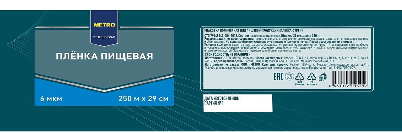 METRO PROFESSIONAL Пленка пищевая 29см 6мкм, 250м - универсальная пленка для ежедневного использования. Идеально подходит для хранения продуктов в холодильнике и упаковки свежих блюд. Оптимальная ширина 29 см удобна для упаковки тарелок и контейнеров, а длины 250 м хватит надолго. Пленка легко отматывается, плотно облегает продукты и посуду любой формы, хорошо фиксируется на поверхности. Благодаря оптимальной плотности 6 мкм она устойчива к разрывам и надежно защищает продукты от влаги и посторонних запахов.