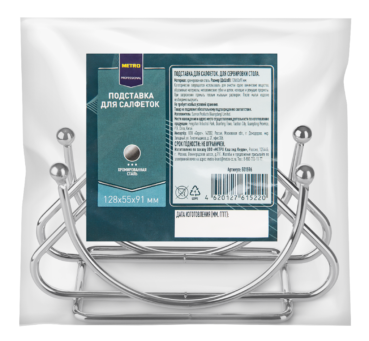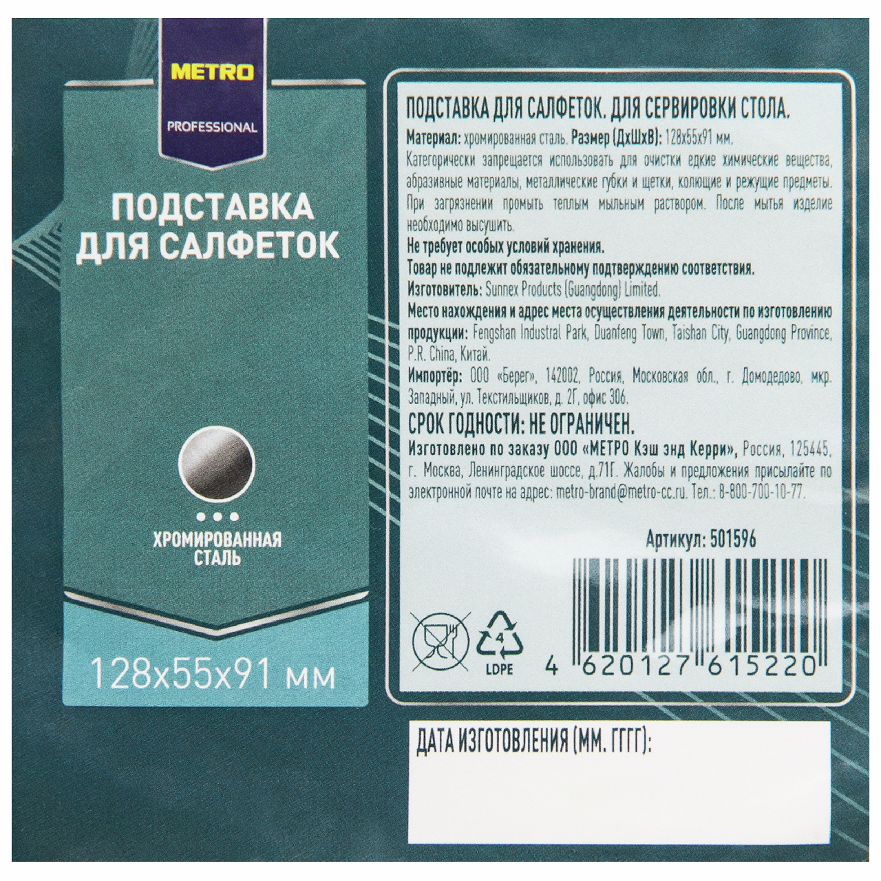 METRO PROFESSIONAL Подставка для салфеток хромированная сталь – это изящный, лаконичный декоративный элемент, который завершает эстетическую наполненность сервировки. Он отлично подходит для дома, офиса, кафе, гостиницы или ресторана. Стильная форма, аккуратные ножки и компактные размеры служат главными преимуществами при выборе такой салфетницы. Она не окислится и не прогнется со временем, поскольку сделана из прочного материала. Хромированная сталь выглядит современно и дорого. Ухаживать за таким аксессуаром легко – достаточно протереть его влажной тряпкой. Хром не стоит чистить абразивными средствами. При использовании щадящих растворов и мягких губок хромированная сталь сохранит свой зеркальный блеск в течение длительного времени. Металлическая салфетница выделяется минималистичным дизайном, поэтому впишется в любой интерьер. Она идеально подходит для салфеток стандартного размера. Ее можно приобрести как для собственного использования, так и презентовать на какой-либо праздник. Подставка для салфеток METRO PROFESSIONAL подчеркнет атмосферу за трапезой!