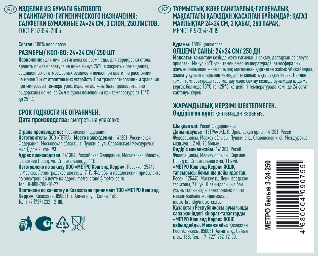 METRO PROFESSIONAL Салфетки бумажные 3 слоя белые 250шт, 24х24см