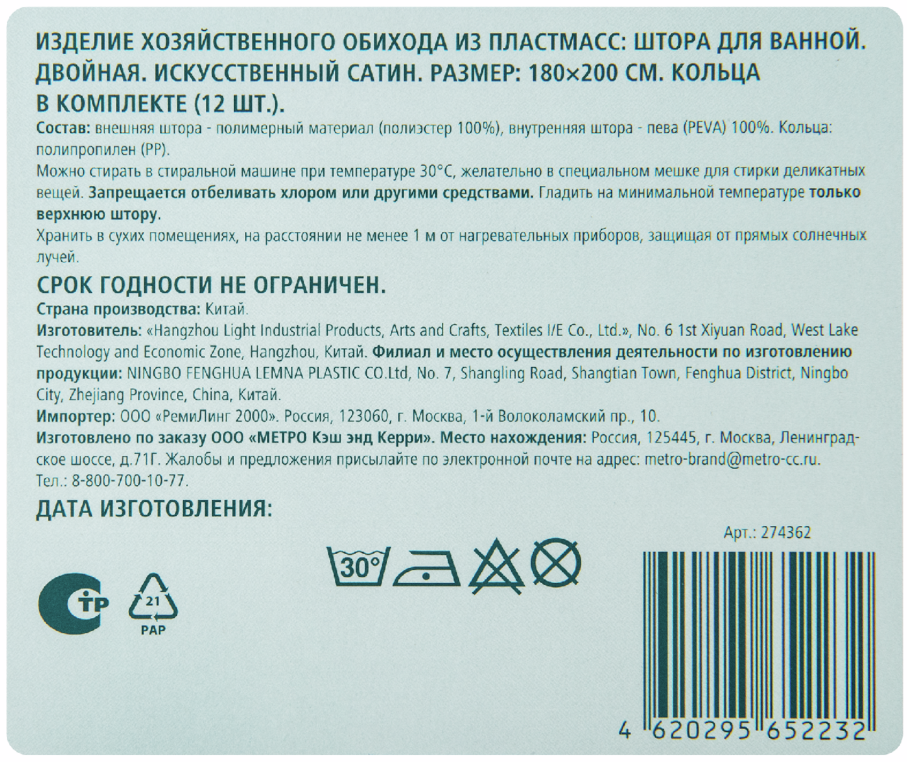 Штора для ванной. Двойная. Со встроенными кольцами. Можно стирать в стиральной машине при температуре 30 градусов, желательно в специальном мешке для стирки деликатных вещей. Запрещается отбеливать хлором или другими средствами. Гладить на минимальной температуре только верхнюю штору.