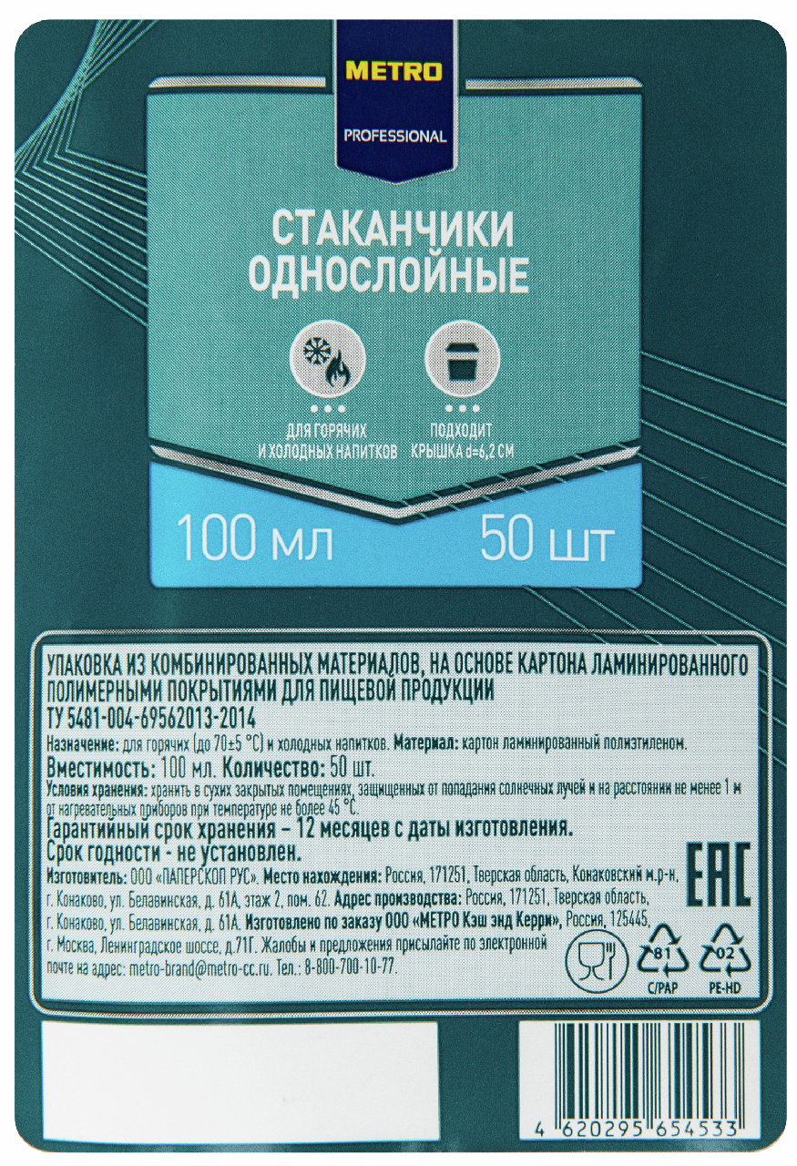METRO PROFESSIONAL Стакан бумажный белый 100мл, 50шт