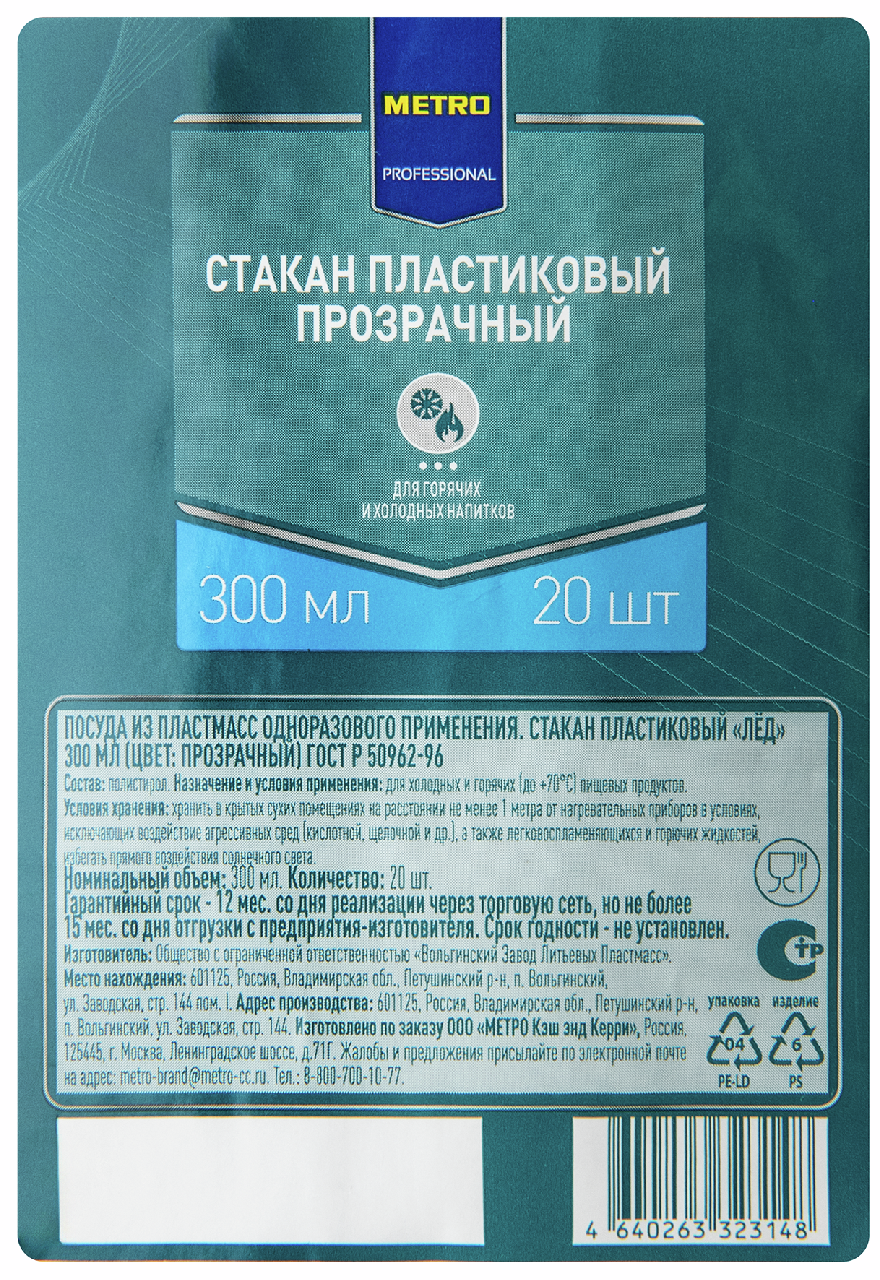 METRO PROFESSIONAL Стакан прозрачный Кристалл лед пластиковый 300мл, 20шт