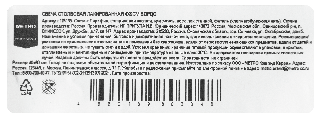 Свеча METRO PROFESSIONAL станет идеальным дополнением для создания волшебного настроения в вашем доме. При изготовлении изделия используются высококачественный парафин, стеариновая кислота и воск. Тщательно подобранные материалы обеспечивают долговечность, предотвращая копчение и треск при горении. Лакированная поверхность придает свече изысканный вид, что делает ее идеальным выбором для любого торжества или повседневного использования. Свеча выполнена в классическом стиле, придавая вашему пространству шарм и элегантность. Независимо от того, украшает ли она ваш стол во время ужина, создает атмосферу на вечеринке или служит центральным элементом декора, этот аксессуар подчеркнет ваш неповторимый стиль. Свеча идеально подходят для использования в доме, ресторане, на вечеринке или в любом месте, где требуется добавить тепла и уюта. Она станет прекрасным дополнением на праздниках, создавая атмосферу радости и праздничного настроения. Рекомендуется хранить изделие в прохладном и темном месте, подальше от прямых солнечных лучей. При необходимости можно протирать лакированную поверхность мягкой сухой тканью для поддержания блеска.
