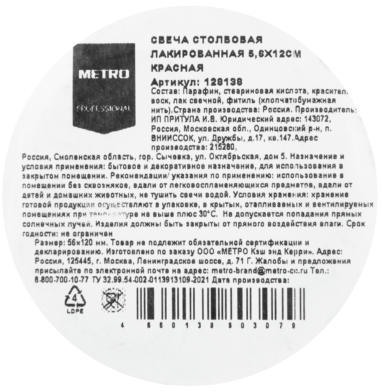 Свеча METRO PROFESSIONAL станет идеальным дополнением для создания волшебного настроения в вашем доме. При изготовлении изделия используются высококачественный парафин, стеариновая кислота и воск. Тщательно подобранные материалы обеспечивают долговечность, предотвращая копчение и треск при горении. Лакированная поверхность придает свече изысканный вид, что делает ее идеальным выбором для любого торжества или повседневного использования. Свеча выполнена в классическом стиле, придавая вашему пространству шарм и элегантность. Независимо от того, украшает ли она ваш стол во время ужина, создает атмосферу на вечеринке или служит центральным элементом декора, этот аксессуар подчеркнет ваш неповторимый стиль. Свеча идеально подходят для и��пользования в доме, ресторане, на вечеринке или в любом месте, где требуется добавить тепла и уюта. Она станет прекрасным дополнением на праздниках, создавая атмосферу радости и праздничного настроения. Рекомендуется хранить изделие в прохладном и темном месте, подальше от прямых солнечных лучей. При необходимости можно протирать лакированную поверхность мягкой сухой тканью для поддержания блеска.