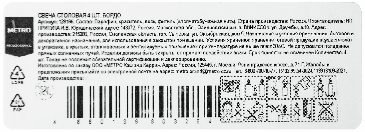 METRO PROFESSIONAL Свеча столовая бордо, 4шт
