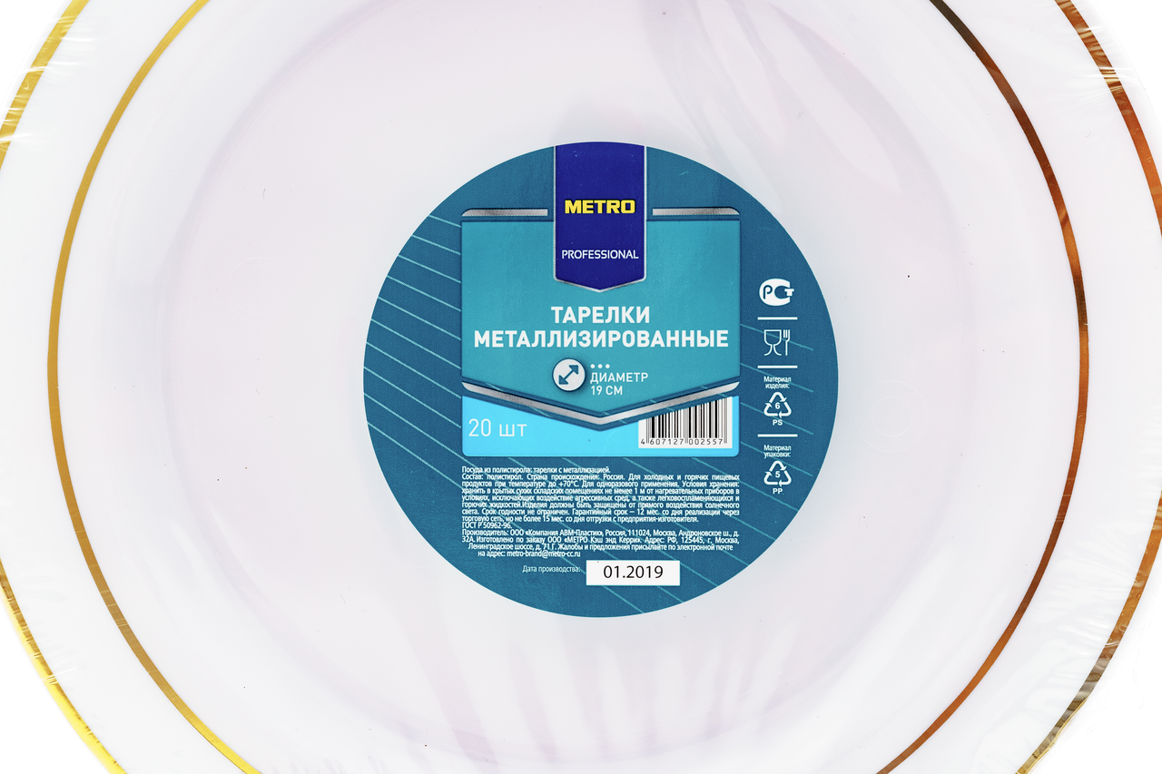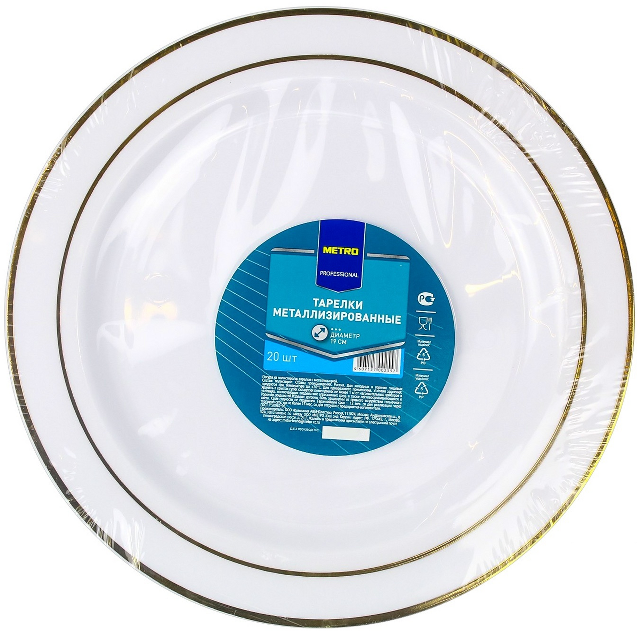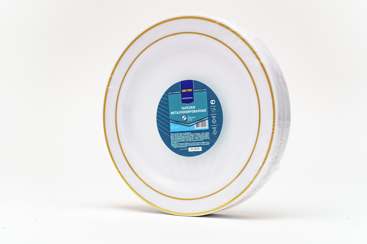 METRO PROFESSIONAL Тарелка одноразовая металлизированная из полистирола белая с золотым ободком 19см, 20шт
