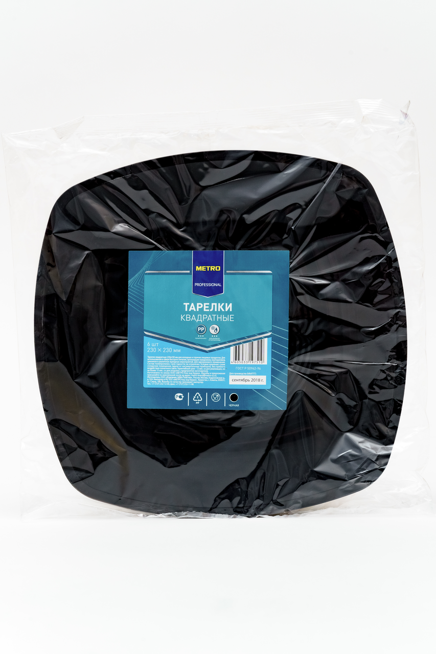 METRO PROFESSIONAL Тарелки черные, 6 шт., 230 мм отличаются привлекательным дизайном. Квадратные темные тарелки с высокими бортиками будут эффектно смотреться на праздничном столе. Их можно использовать для подачи разнообразных блюд. На них можно красиво разложить мясные, сырные, овощные или фруктовые нарезки. Они подходят для горячих блюд с соусами и для салатов с заправками, для разнообразных закусок и десертов. Одноразовые черные тарелки станут украшением праздничного застолья, неформальных вечеринок, выездных мероприятий. Их удобно брать в поход, в дорогу или на пикники. Такую посуду можно использовать для презентации продуктов питания во время дегустаций и промоакций. Одноразовые тарелки незаменимы в службах доставки еды. Их можно использовать для подачи блюд в кафе быстрого питания, на летних площадках с мангалами и барбекю, в других предприятиях общественного питания. После использования их просто утилизируют, что удобно и экономит время и силы персонала. Тарелки полностью соответствуют требованиям и качественным стандартам, установленным контролирующими органами. Они безопасны для детей и взрослых. Обладают достаточным запасом прочности, не прогибаются под тяжестью пищи и не ломаются при правильной транспортировке. При соблюдении правил хранения, установленных производителем, могут храниться длительное время.