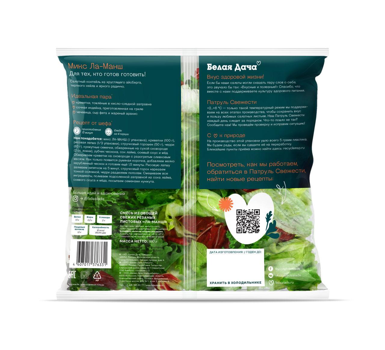 Салатный микс Ла-Манш Белая Дача - для тех, кто готов готовить! 100% готов к столу: вымыт, просушен, нарезан. Салатный коктейль из хрустящего айсберга, терпкого кейла и яркого радиччо. В состав микса Ла-манш входит уникальная зелень - кейл.