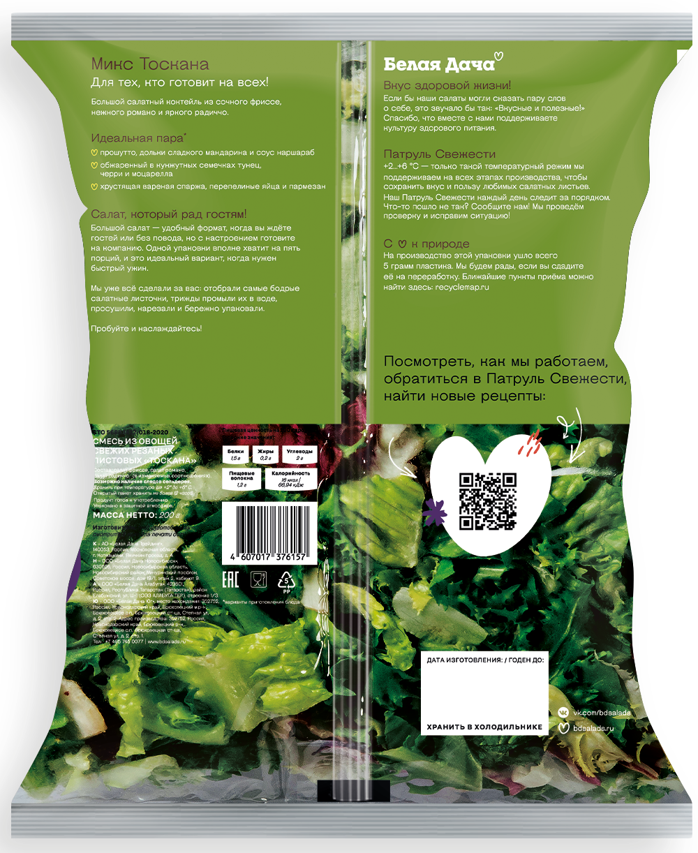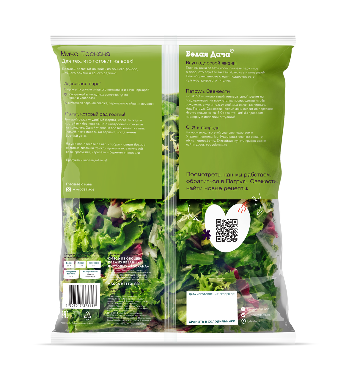 Салатный микс Тоскана Белая Дача -для тех, кто готовит на всех! 100% готов к столу: вымыт, просушен, нарезан. Большой салатный коктейль из сочного фриссе, нежного романо и яркого радиччо. Салат, который рад гостям!