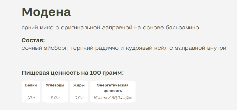 Салатный микс с оригинальной заправкой на основе бальзамико внутри. Модена — новинка в линейке сезонных миксов. Пряные листья радиччо, хрустящего кейла и сочного айсберга — отличная основа для лёгких салатов. А чтобы готовить стало ещё удобнее, в каждую упаковку мы добавили стик с классической итальянской заправкой.