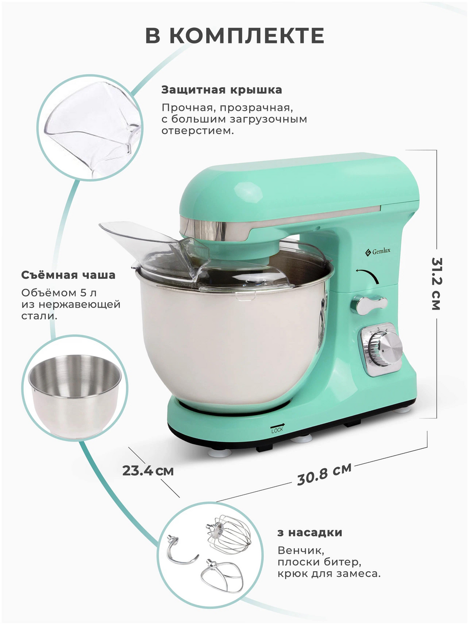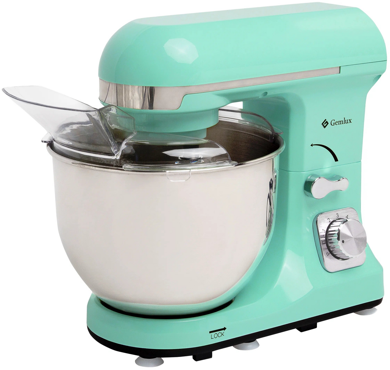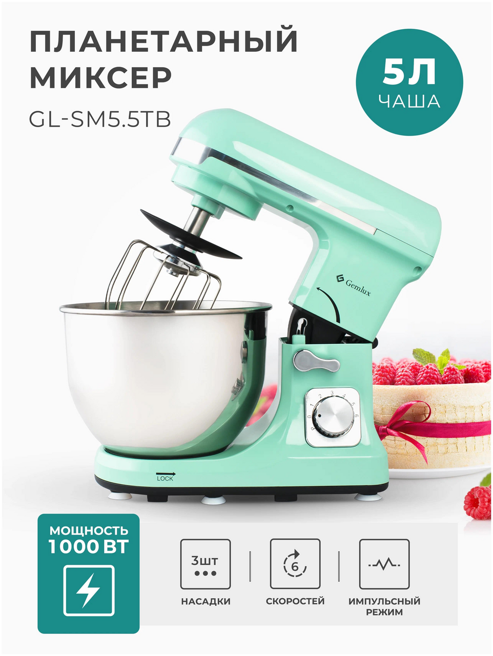 Настольный планетарный миксер Gemlux GL-SM5.5TB предназначен для замеса дрожжевого и бездрожжевого теста различной вязкости, взбивания яиц, сливок, кремов и муссов, приготовления пюре, фарша и т. п. Это бюджетная модель с достаточно мощным двигателем (1000 Вт), шестью скоростями вращения мешалки и режимом пульс (кратковременное включение на максимальной мощности). В комплект поставки миксера входят: — съемная дежа (чаша) объемом 5 л из нержавеющей стали, — защитная крышка дежи из недорогого, но прочного и не теряющего прозрачности с течением времени MS-пластика. Широкий загрузочный желоб позволяет добавлять ингредиенты в дежу в процессе замеса, — проволочный венчик, — плоский битер (лопатка), — крюк для замеса дрожжевого теста. Привод миксера и все три мешалки – цельнометаллические, что гарантирует им долгий срок службы даже при высокой нагрузке. Корпус изготовлен из прочного и надежного ABS-пластика мятного цвета (тиффани). Шесть резиновых ножек с присосками надежно фиксируют оборудование на поверхности стола. Рабочая головка откидывается для удобства снятия и установки дежи и мешалки и закрепляется специальным рычагом.