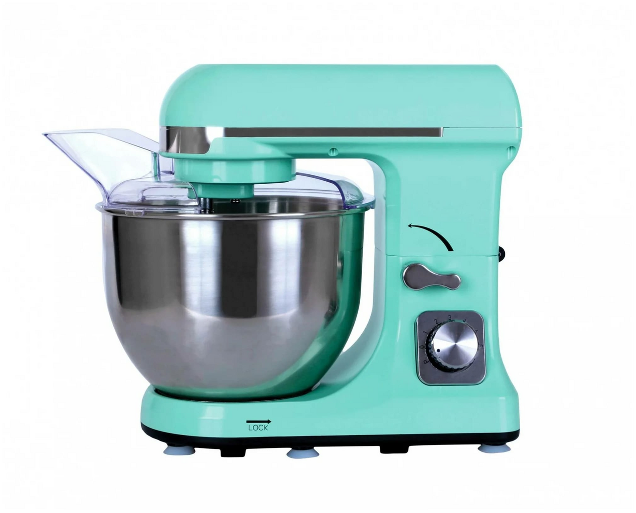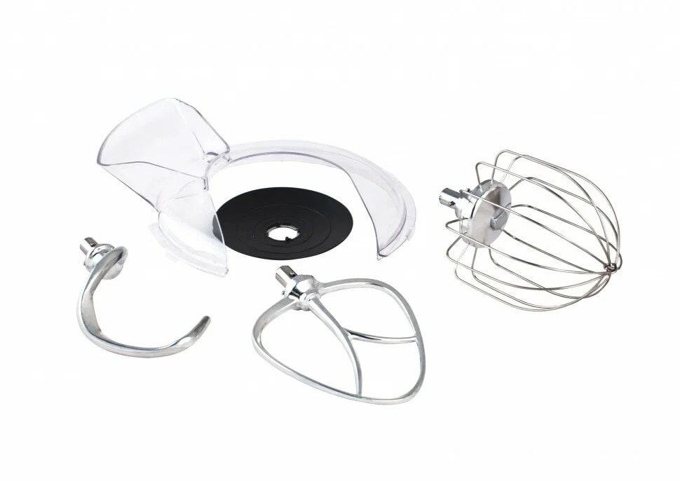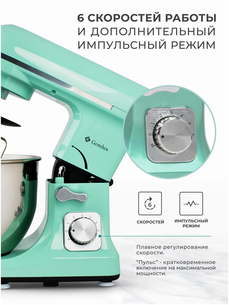 Настольный планетарный миксер Gemlux GL-SM5.5TB предназначен для замеса дрожжевого и бездрожжевого теста различной вязкости, взбивания яиц, сливок, кремов и муссов, приготовления пюре, фарша и т. п. Это бюджетная модель с достаточно мощным двигателем (1000 Вт), шестью скоростями вращения мешалки и режимом пульс (кратковременное включение на максимальной мощности). В комплект поставки миксера входят: — съемная дежа (чаша) объемом 5 л из нержавеющей стали, — защитная крышка дежи из недорогого, но прочного и не теряющего прозрачности с течением времени MS-пластика. Широкий загрузочный желоб позволяет добавлять ингредиенты в дежу в процессе замеса, — проволочный венчик, — плоский битер (лопатка), — крюк для замеса дрожжевого теста. Привод миксера и все три мешалки – цельнометаллические, что гарантирует им долгий срок службы даже при высокой нагрузке. Корпус изготовлен из прочного и надежного ABS-пластика мятного цвета (тиффани). Шесть резиновых ножек с присосками надежно фиксируют оборудование на поверхности стола. Рабочая головка откидывается для удобства снятия и установки дежи и мешалки и закрепляется специальным рычагом.
