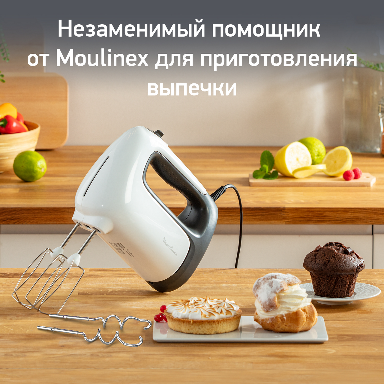 Миксер ручной Moulinex Prepmix+ HM460110 — незаменимый помощник на кухне. С его помощью можно готовить крем-супы, гаспачо, минестроне или соусы по типу бешамель, песто, болоньезе. Миксер пригодится при создании изысканных десертов, муссов, парфе, сорбетов или мороженого. Благодаря высокоэффективному мотору мощностью 500 Вт прибор гарантирует идеальное смешивание продуктов, жидкого и плотного теста для вафель, кексов и блинов. Миксер поможет приготовить разнообразные закуски: хумус, гуакамоле или песто айоли. Его также можно использовать для взбивания молочных коктейлей, смузи или фруктовых пюре. В комплект входят венчики и крюки для теста, выполненные из высококачественной нержавеющей стали. Они помогают быстро взбивать любые заготовки: от яичных белков и взбитых сливок до теста для пиццы. Пластиковый корпус миксера Moulinex Prepmix+ хорошо противостоит внешним негативным факторам: воздействию влаги, пыли, механических нагрузок, УФ-излучения и перепадов температуры. Модель запрограммирована на пять скоростей, также предусмотрен турборежим для интенсивного смешивания или измельчения ингредиентов. Съемные венчики снимаются одним движением руки и очищают��я в посудомоечной машине. Такой подход экономит время и силы после приготовления блюд. Компактные размеры позволяют хранить прибор в любом месте: кухонном шкафу, на полках, в пенале и с удобством переносить с собой.