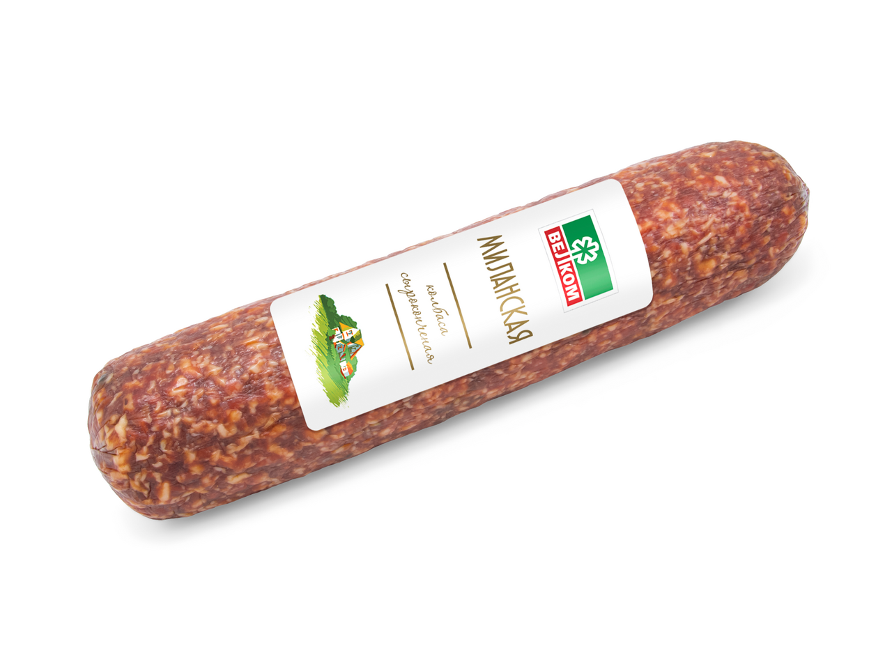Колбаса Миланская ВЕЛКОМ с/к – это сочетание оригинальной специально разработанной рецептуры и современных технологий производства. Отлично подойдет как для бутербродов, так и для приготовления салатов, авторских холодных закусок. Мясо для колбасы поставляется с образцовых животноводческих хозяйств, оснащенных передовым оборудованием. Продукт обрабатывается и проходит строгий контроль качества.Колбаса Миланская ВЕЛКОМ с/к сохраняет свои полезные качества и вкус благодаря особому методу копчения. Купить ее можно в торговом центре METRO Cash & Carry по доступной цене.Состав: говядина, свинина, шпик, соль, перец, кардамон, имбирь, чеснок, горчица, сельдерей, сахара, усилитель вкуса (глутамат натрия), антиокислитель (аскорбиновая кислота), перец зеленый горошек, фиксатор окраски (нитрит натрия). Пищевая ценность на 100 г продукта: белки - не менее 14 г, жир - не более 43 г. Энергетическая ценность: 447 ккал. Хранить при t от 0 до +6 оC. Срок годности: 45 дней. Срок годности после вскрытия упаковки: не более 3 дней.