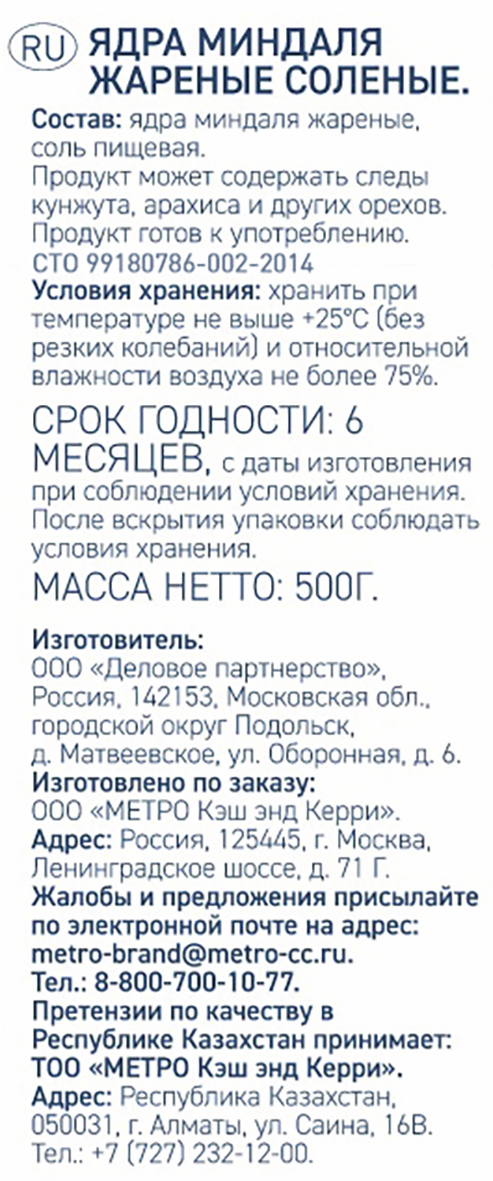 Миндаль METRO Chef Жареный соленый, 500 г – это полезный перекус, который никого не оставит равнодушным. Такие орехи содержат в себе большое количество витаминов, антиоксидантов, минеральных элементов и т.д. Белок миндаля обладает повышенной пищевой ценностью, за счет чего рекомендован вегетерианцам для восполнения запасов белка. Продукт способен укреплять иммунную систему, избавлять от бессонницы, стимулировать кишечную перильстатику, поднимать настроение, заряжать энергией и бодростью. Кроме того, миндаль успокаивает нервы и предотвращает раннее старение организма. METRO Chef – это популярный бренд, который принадлежит торговой сети Метро. Продукция под этой маркой разработана и протестирована при участии представителей ресторанного бизнеса. В ассортимент бренда METRO Chef входят такие категории товаров, как молочные продукты, мясная гастрономия, соусы и приправы, замороженные фрукты и ягоды, рыба и морепродукты и многое другое. Выпуская продукцию под собственными торговыми марками METRO, мы стремимся максимально удовлетворить потребности наших клиентов. Наша цель – понять, какой ассортимент для них актуален и предложить его по привлекательной цене. Мы также внимательно изучаем тенденции рынка, чтобы быть в курсе последних трендов и своевременно предлагать решения под собственными торговыми марками в соответствии с ними.