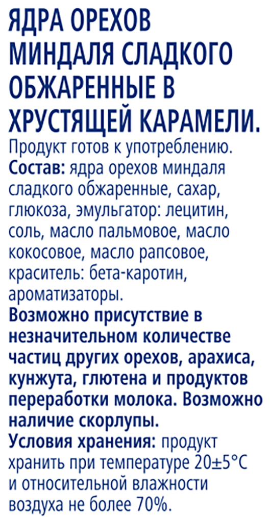 Миндаль в карамели METRO Chef, 150 г – это вкусное и сладкое лакомство, которое обязательно понравится и детям, и взрослым. Обжаренные сладкие орешки очень ароматные, питательные и калорийный, поэтому дегустировать их рекомендуется малыми порциями либо в большой веселой компании друзей в качестве закуски к пуэру или глинтвейну. Хрустящие аппетитные ядра можно брать с собой и употреблять в качестве сытного перекуса между основными приемами пищи. Карамелизированный миндаль можно раздробить и использовать в качестве присыпки на кексы и пирожные, а также смешивать с изюмом и другими сухофруктами, применяя его как начинку в пироги или рулеты. Орехи полезны для организма: они обогащены железом, кальцием, калием и магнием. Миндаль содержит аминокислоты, ненасыщенные жиры, витамины Е и группы В, благодаря чему при регулярном употреблении оказывает положительное воздействие на работу сердца, сосудов, улучшает состояние кожи и волос.