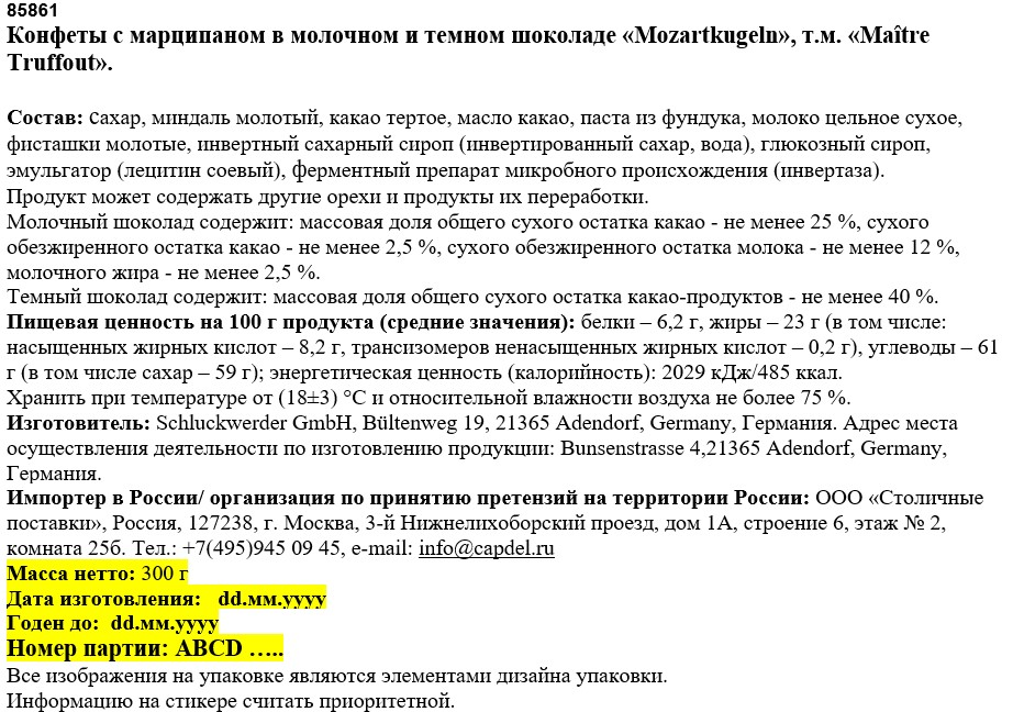 Сахар, миндаль молотый 14%, какао тёртое, масло какао, мякоть фундука 4%, сухое цельное молоко, молотые фисташки 0,9%, инвертный сахарный сироп, глюкозный сироп, эмульгатор: Е322; увлажнитель: E1103.