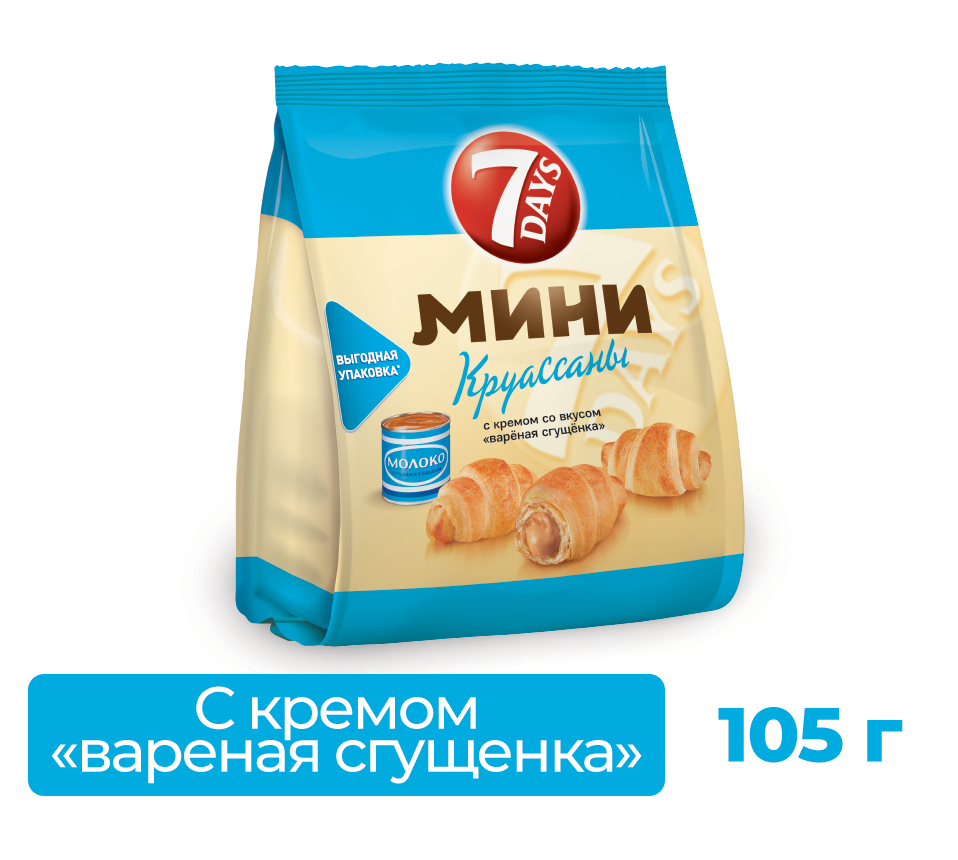 Мини круассаны 7Days с кремом со вкусом вареная сгущенка — маленькие мягкие круассаны из слоеного теста с нежной кремовой начинкой. Оцените великолепное сочетание превосходного вкуса, тающего крема со вкусом вареная сгущенка и слоев воздушного теста! Мини круассаны с начинкой — прекрасный способ поднять себе настроение и получить заряд оптимизма для продуктивного дня. Выпечка 7Days отлично подойдет к чаю и кофе. Поставьте дела на паузу, насладитесь круассанами и зарядитесь энергией для новых свершений! Круассаны 7Days в компактной упаковке 105 г — удобный формат, чтобы насладиться выпечкой одному или разделить удовольствие с близкими. Круассаны подойдут для пикника, прогулки, перекуса в офисе или для поездки в поезде или на машине