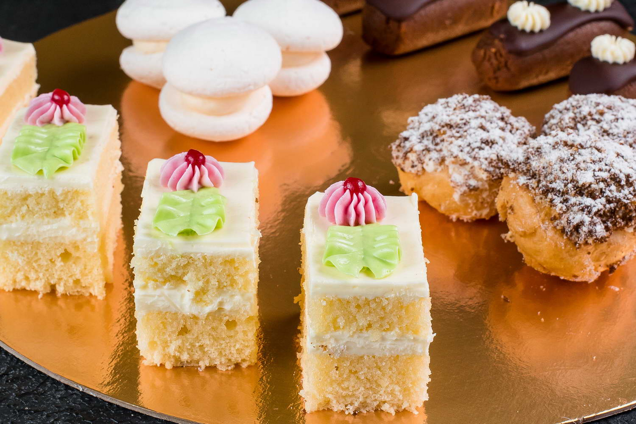 Набор нежнейших пирожных состоящий из: пирожное заварная трубочка с обсыпкой (заварная трубочка заполненная нежным кремом, поверхность пирожного покрыта кремом и обсыпана воздушной бисквитной крошкой сахарной пудрой), пирожное воздушное с кремом (два воздушных безе прослоенные нежным сливочным кремом), пирожное бисквитное со сливочным кремом (пропитанные сиропом нежные слои бисквита, прослоенные сливочны�� кремом, украшено пирожное сливочным кремом и фруктовой начинкой), пирожное картошка глазированная (вкуснейшая крошковая масса с кремом и какао, в форме картошки украшено пирожное помадкой и сливочным кремом). Они идеально подходят для встречи с друзьями за чашечкой чая.
