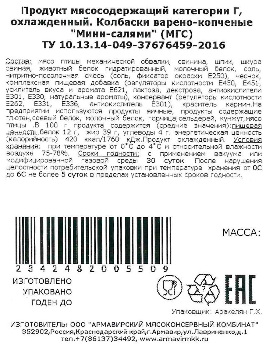 Мини-салями Армавирский МК варено-копченые, ~500г