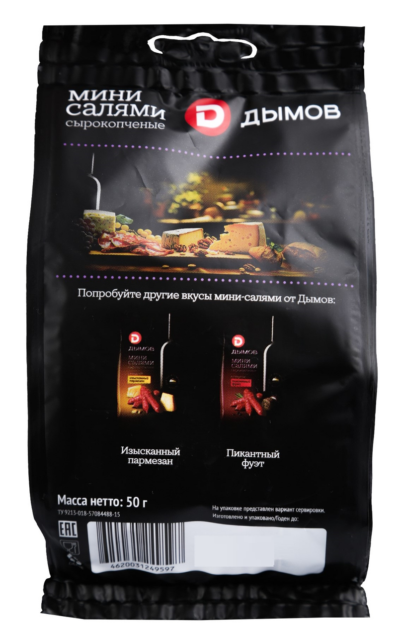 Мини-салями Дымов со вкусом Черный трюфель - это насыщенные мясные сырокопченые колбаски с нотками черного трюфеля. Подходят для мясных тарелок и в качестве закусок под вино и пиво. Их удобно брать с собой на пикник или в дорогу.