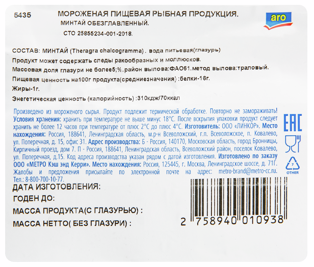 Минтай, вода питьевая (защитная ледяная глазурь).