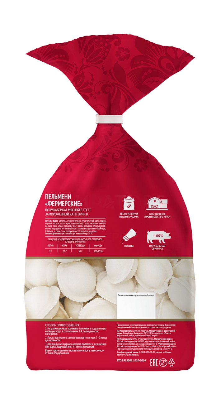 Пельмени МИРАТОРГ Фермерские, 800 г – это вкусный мясной продукт, который никого не оставит равнодушным. Он способен досыта накормить всю семью и угостить гостей. Отличительными особенностями являются тесто из муки высшего сорта, собственное производство мяса, натуральная свинина и различные ароматные специи. Продукт помещен в красивую, яркую упаковку. В состав начинки входят: свинина, вода, репчатый лук, соль, перец и чеснок. В основе теста лежит пшеничная мука высшего сорта, яичный порошок, масло подсолнечное. Пельмени относятся к категории В. Это означает, что мясной мякоти внутри должно быть не менее 40% и не более 60%. В процессе приготовления изделия не разваливаются и не лопаются. Их можно как варить, так и жарить на сковороде. Срок хранения продукта составляет 12 месяцев. Пищевая ценность на 100 г равна 360 ккал. Максимальная температура хранения: -18 С.Мираторг – это один из крупных производителей мяса в России. Он начал свою работу в 1995 году. Штаб-квартира расположена в Москве. В настоящее время количество сотрудников на предприятии составляет 39000 человек. Приобрести пельмени МИРАТОРГ Фермерские, 800 г можно в торговом центре METRO.