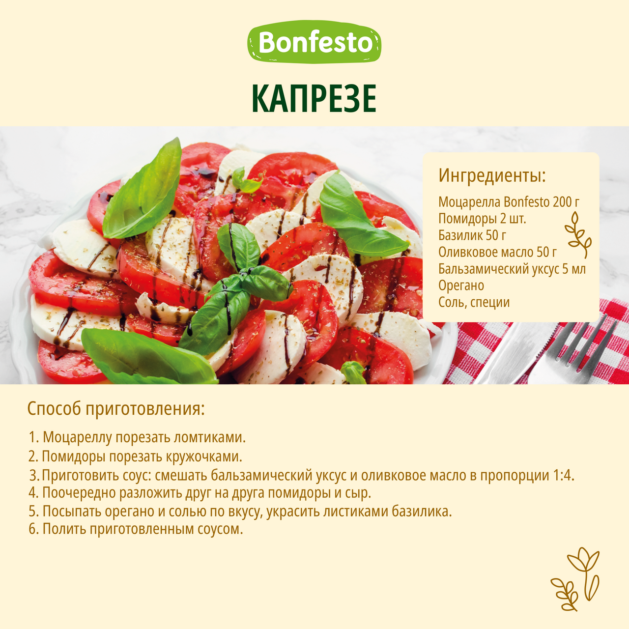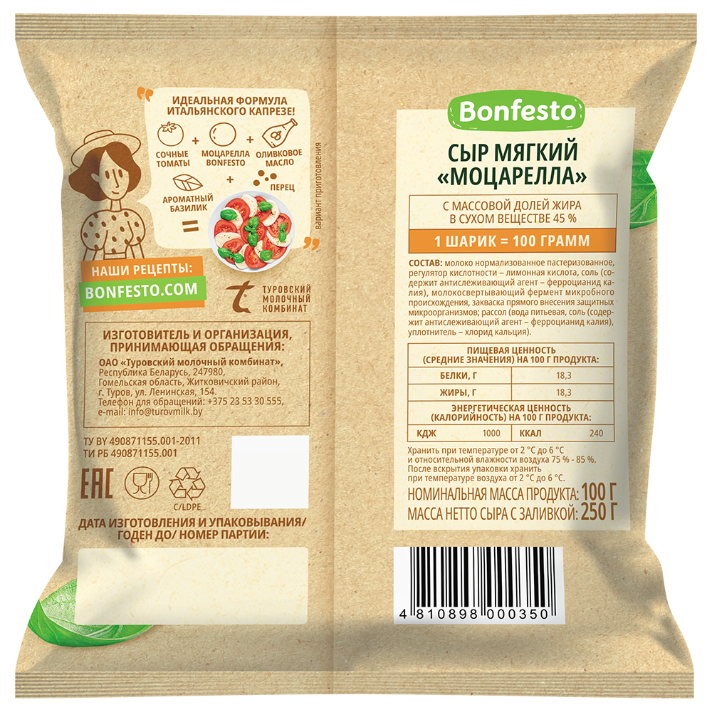 Сыр мягкий Моцарелла — один из самых известных итальянских сыров. Это классическая моцарелла в рассоле. По своей внутренней структуре моцарелла немного слоистая и не содержит пузырьков воздуха. Это традиционный продукт в меню европейского стола, многих салатов и закусок. Самым известным итальянским национальным блюдом с моцареллой является капрезе, представляющее собой поочерёдно выложенные ломтики моцареллы, помидоров и листиков базилика, воссоздавая цветовую гамму итальянского флага. Также хорошо моцарелла сочетается со всеми овощами, салатами.