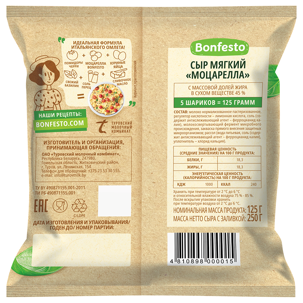 Сыр Моцарелла Bonfesto 45% весом 125 г (5 шариков по 25 г) – классический итальянский продукт, который относится к категории мягких молодых сыров. Он созревает, как правило, за несколько дней. По своей структуре это немного слоистый сыр, в котором нет пузырьков воздуха. Он имеет шаровидную форму и ярко-белый цвет. Вкус у Моцареллы – нежный и пресноватый, довольно близкий к творожным сырам. Данный продукт считается традиционным в меню европейского стола, в частности, многих салатов и закусок. В процессе его производства для заквашивания молока применяются молочнокислые культуры. Сырная масса при этом постоянно перемешивается, после чего вымешивается до эластичного состоянии и периодически нагревается. Шарики Моцареллы обычно формируют вручную, отрезка от большого куска небольшие фрагменты. Этот вид сыра достаточно богат фосфором и кальцием. Он положительно влияет на костную системе и зубную эмаль. Витамин B12, также входящий в его состав, участвует в кроветворении – это позволяет предотвратить развитие анемии. В кулинарии Моцарелла может использоваться как самостоятельная закуска или в качестве полноправного компонента сырной тарелки. Также его часто добавляют в салаты, к примеру, традиционный капрезе невозможен без этого сыра.