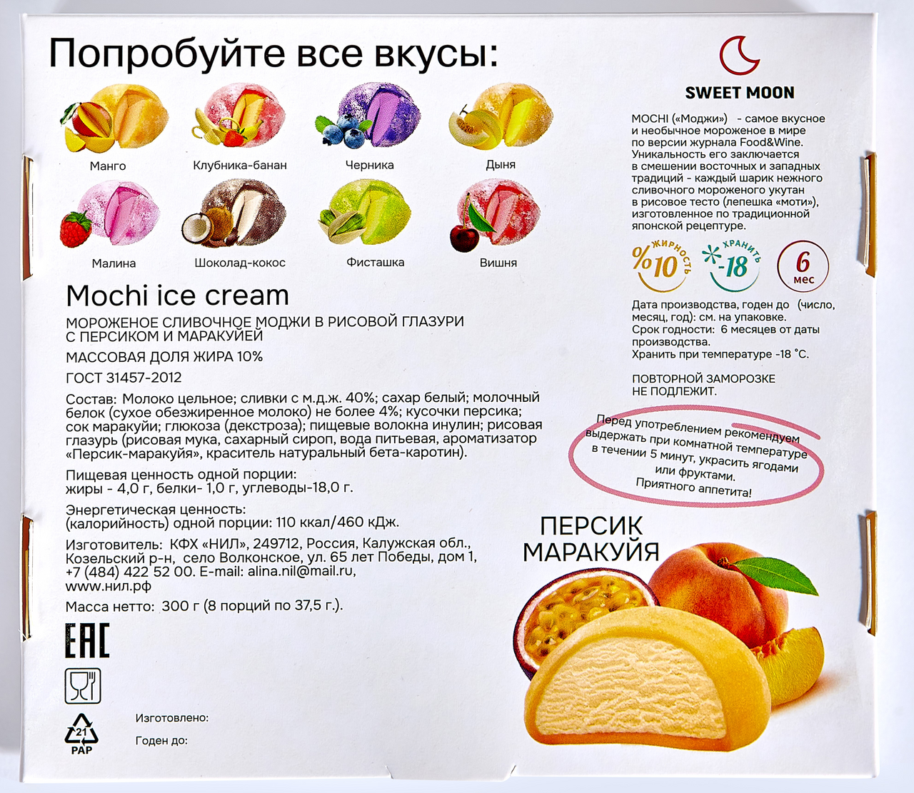Мороженое сливочное Sweet Moon Mochi Ice Cream в рисовой глазури с персиком и маракуйей (35г х 8шт), 300г