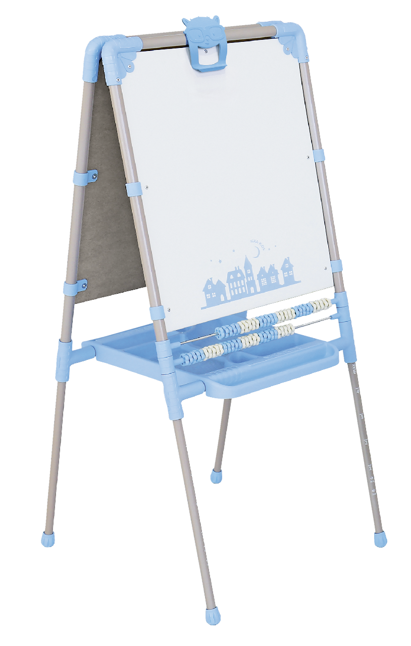 Мольберт детский НИКА, голубой предусматривает две рабочие поверхности размером 530х470 мм. На одной малыш может рисовать мелками, на другой – маркером (она также предназначена для магнитов). В нижней части мольберта производитель сделал практичный пенал, куда ребенок может складывать фломастеры, мелки и другие необходимые ему предметы. Кроме того в мольберте есть и яркие цветные счеты, а также магнитный набор для изучения цифр, букв и знаков препинания.