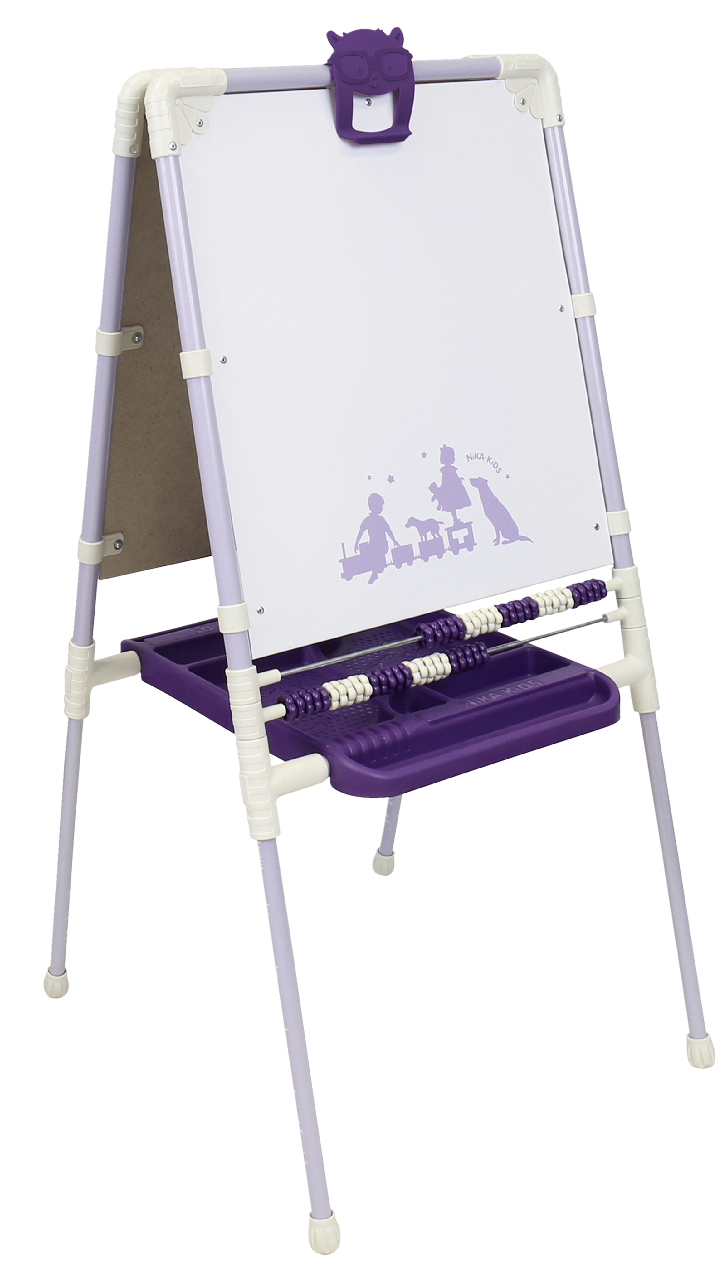 Мольберт детский НИКА, сиреневый предусматривает две рабочие поверхности размером 530х470 мм. На одной малыш может рисовать мелками, на другой – маркером (она также предназначена для магнитов). В нижней части мольберта производитель сделал практичный пенал, куда ребенок может складывать фломастеры, мелки и другие необходимые ему предметы. Кроме того в мольберте есть и яркие цветные счеты, а также магнитный набор для изучения цифр, букв и знаков препинания.