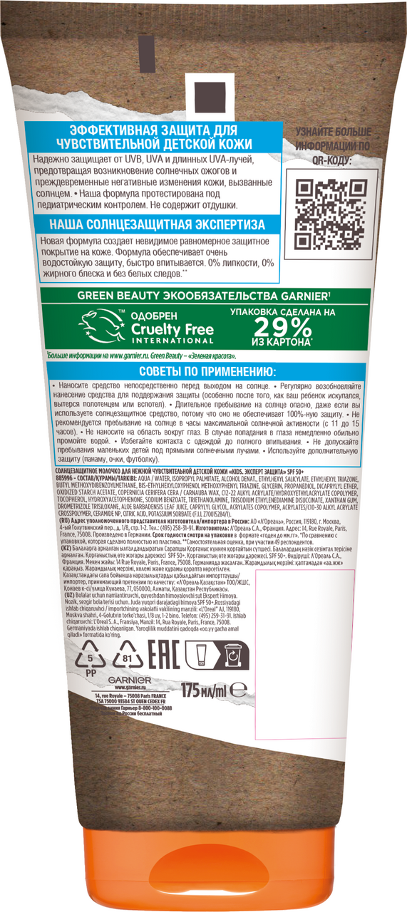 Молочко солнцезащитное детское Garnier Ambre Solaire Kids Эксперт Защита SPF50+, 175мл