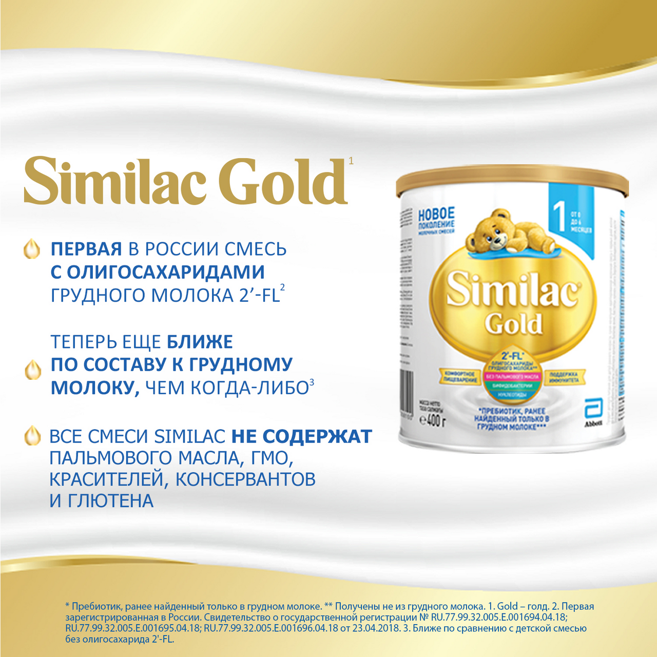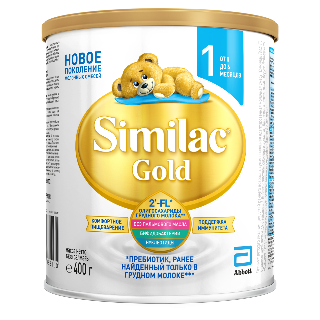 Similac Gold – новое поколение молочных смесей с олигосахаридами грудного молока 2'-FL. Similac Gold – 1-я в России* детская молочная смесь с олигосахаридами грудного молока 2'-FL** – уникальным ингредиентом, укрепляющим иммунную систему, который ранее был обнаружен*** только в грудном молоке. Олигосахариды 2'-FL стимулируют рост полезных бактерий в кишечнике, где находится 70% клеток иммунной системы. Бифидобактерии B.lactis – эффективный и хорошо изученный пробиотик, помогающий развитию здоровой микрофлоры кишечника и поддержанию здоровья пищеварительной системы. Пребиотики FOS являются пищей для полезной микрофлоры кишечника, способствуют мягкому стулу. Нуклеотиды – строительный материал для ДНК всех клеток организма.