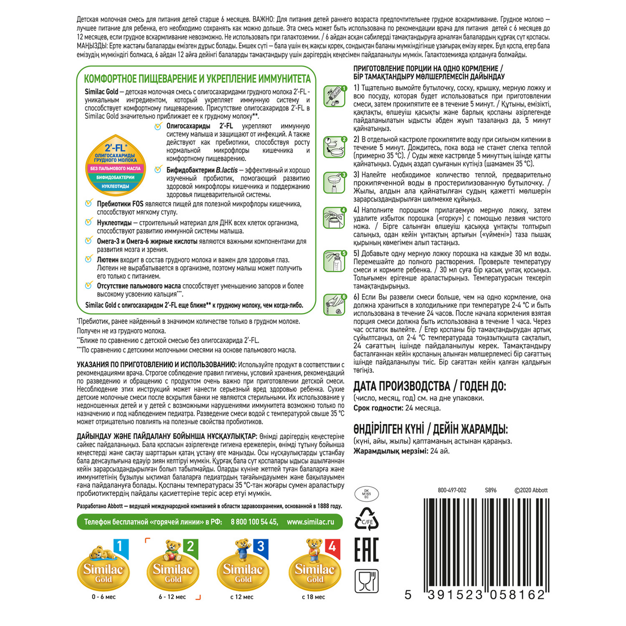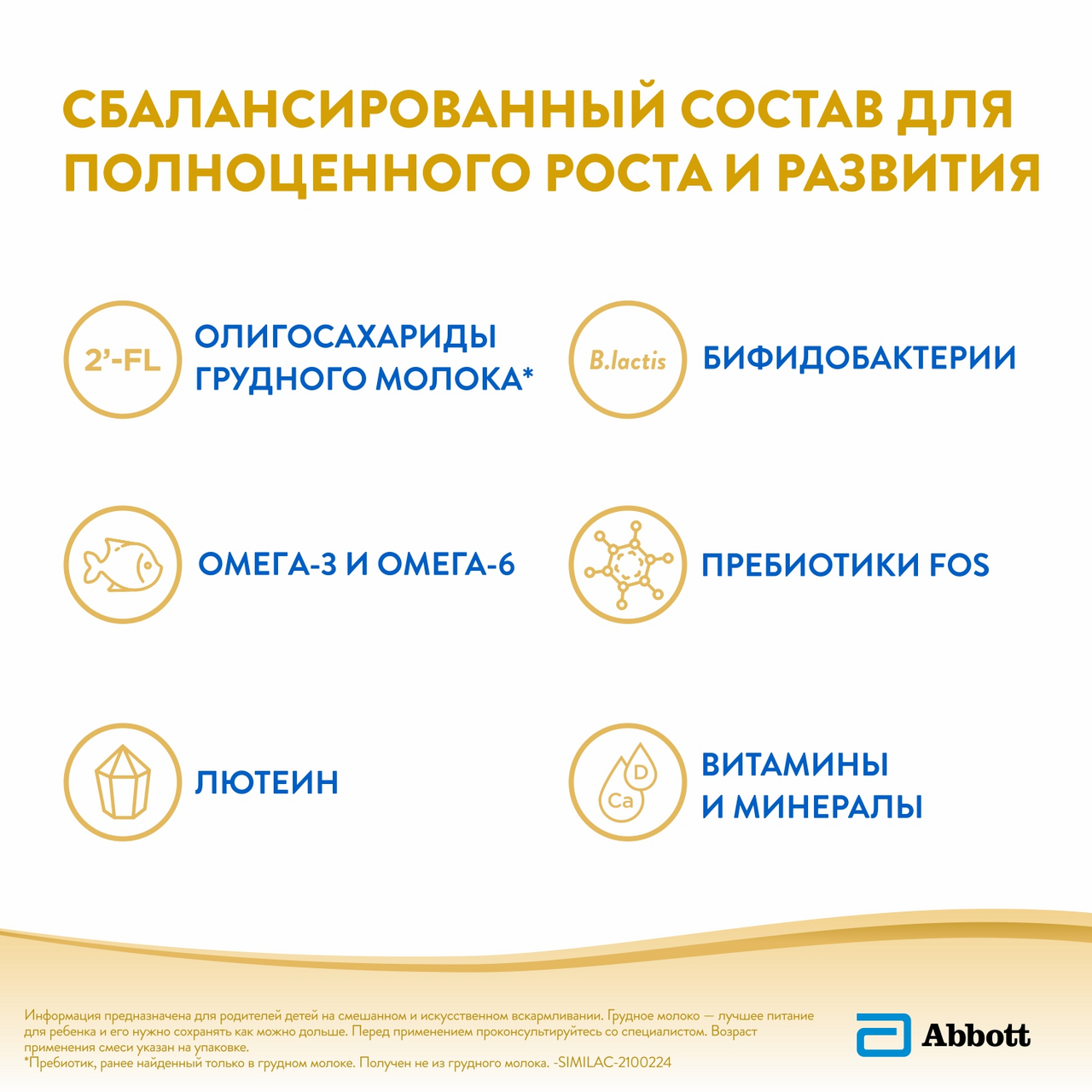 Similac Gold – новое поколение молочных смесей с олигосахаридами грудного молока 2'-FL. Similac Gold – 1-я в России* детская молочная смесь с олигосахаридами грудного молока 2'-FL** – уникальным ингредиентом, укрепляющим иммунную систему, который ранее был обнаружен*** только в грудном молоке. Олигосахариды 2'-FL стимулируют рост полезных бактерий в кишечнике, где находится 70% клеток иммунной системы. Бифидобактерии B.lactis – эффективный и хорошо изученный пробиотик, помогающий развитию здоровой микрофлоры кишечника и поддержанию здоровья пищеварительной системы. Пребиотики FOS являются пищей для полезной микрофлоры кишечника, способствуют мягкому стулу. Нуклеотиды – строительный материал для ДНК всех клеток организма.
