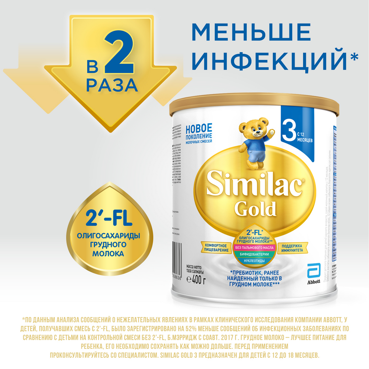 Similac Gold – новое поколение молочных смесей с олигосахаридами грудного молока 2'-FL. Similac Gold – 1-я в России* детская молочная смесь с олигосахаридами грудного молока 2'-FL** – уникальным ингредиентом, укрепляющим иммунную систему, который ранее был обнаружен*** только в грудном молоке. Олигосахариды 2'-FL стимулируют рост полезных бактерий в кишечнике, где находится 70% клеток иммунной системы. Бифидобактерии B.lactis – эффективный и хорошо изученный пробиотик, помогающий развитию здоровой микрофлоры кишечника и поддержанию здоровья пищеварительной системы. Пребиотики FOS являются пищей для полезной микрофлоры кишечника, способствуют мягкому стулу. Нуклеотиды – строительный материал для ДНК всех клеток организма.