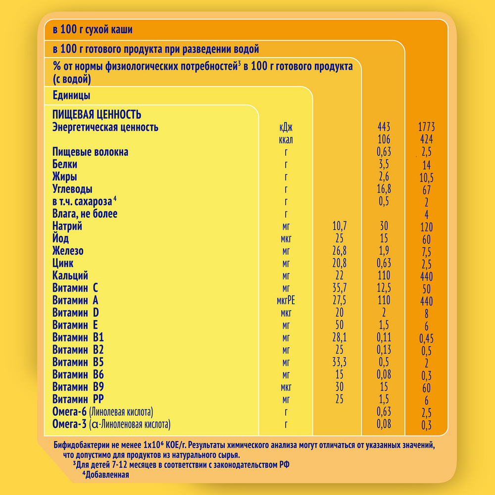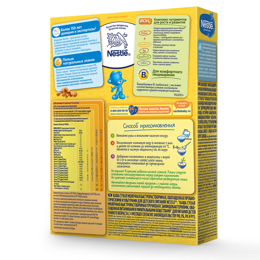 ВАЖНОЕ ПРИМЕЧАНИЕ: идеальной пищей длягрудного ребенка является молоко матери. Всемирная организация здравоохранения рекомендует исключительногрудное вскармливание в первые шесть месяцев и последующее введение прикорма при продолжениигрудного вскармливания. Компания Нестле поддерживает данную рекомендацию. Для принятия решения о сроках и способе введения данного продукта в рацион ребенка необходима консультация специалиста.Состав:гречневая мука, молоко сухое обезжиренное, сахар, мальтодекстрин, витамины и минеральные вещества, бифидобактерии не менее 1х10 КОЕ/г.Содержит 10 витаминов и 5 минеральных веществ.Продукт может содержатьглютен.После приготовления каши вскрытый пакет следует плотно закрыть. После вскрытия упаковки продукт следует хранить не более 2-х недель. Не храните оставшуюся после кормления разведённую кашу.Энергентическая ценность: 429ккал/1796кДж.Условия хранения: от 6C до 25CСрокгодности: 15 месяцев