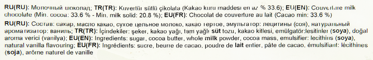 Сахар, масло какао, какао-тертое, сухое цельное молоко, эмульгатор: соевый лецитин, натуральный ароматизатор: ваниль.