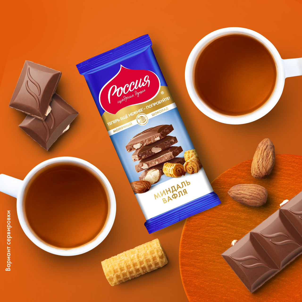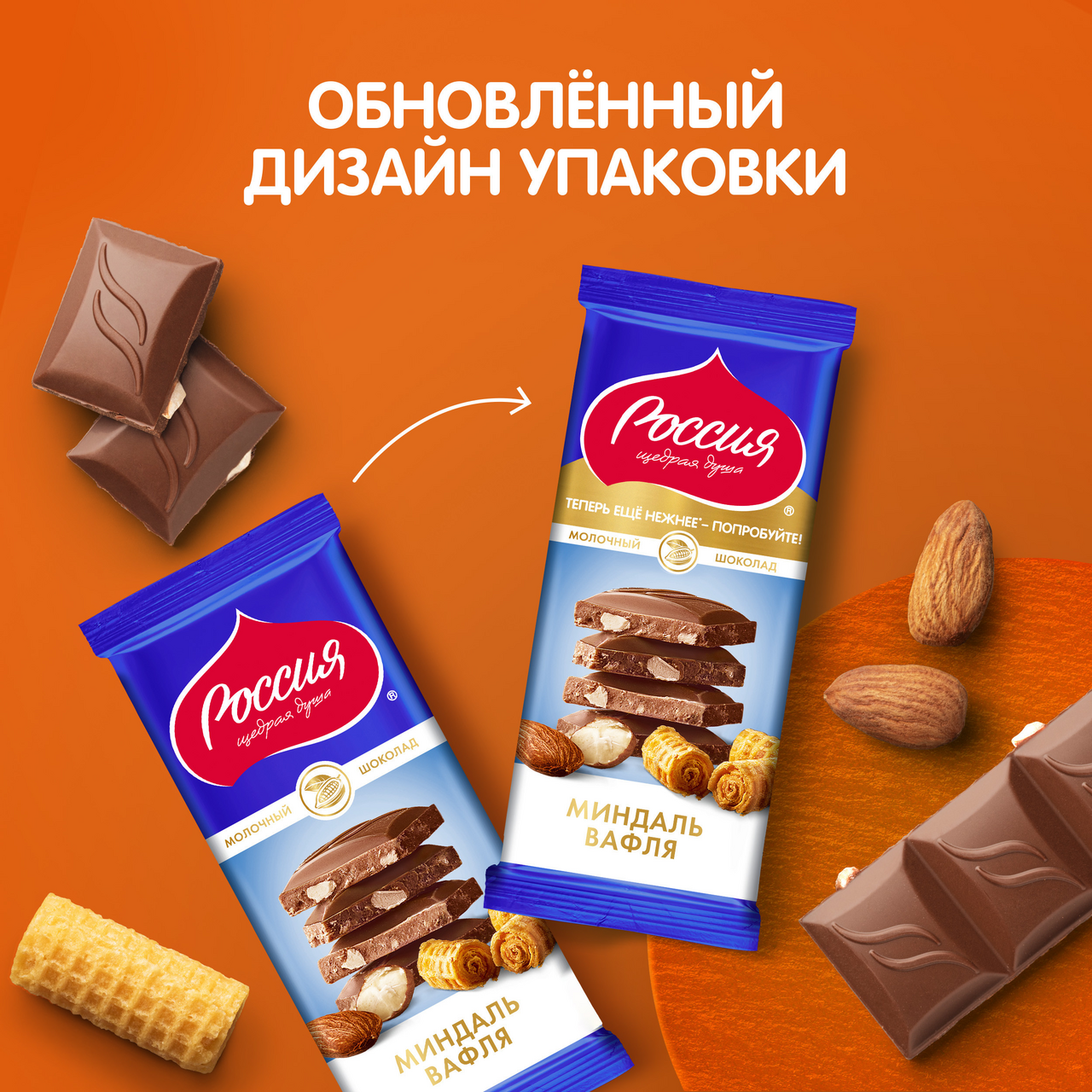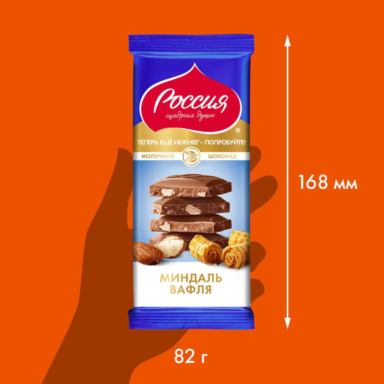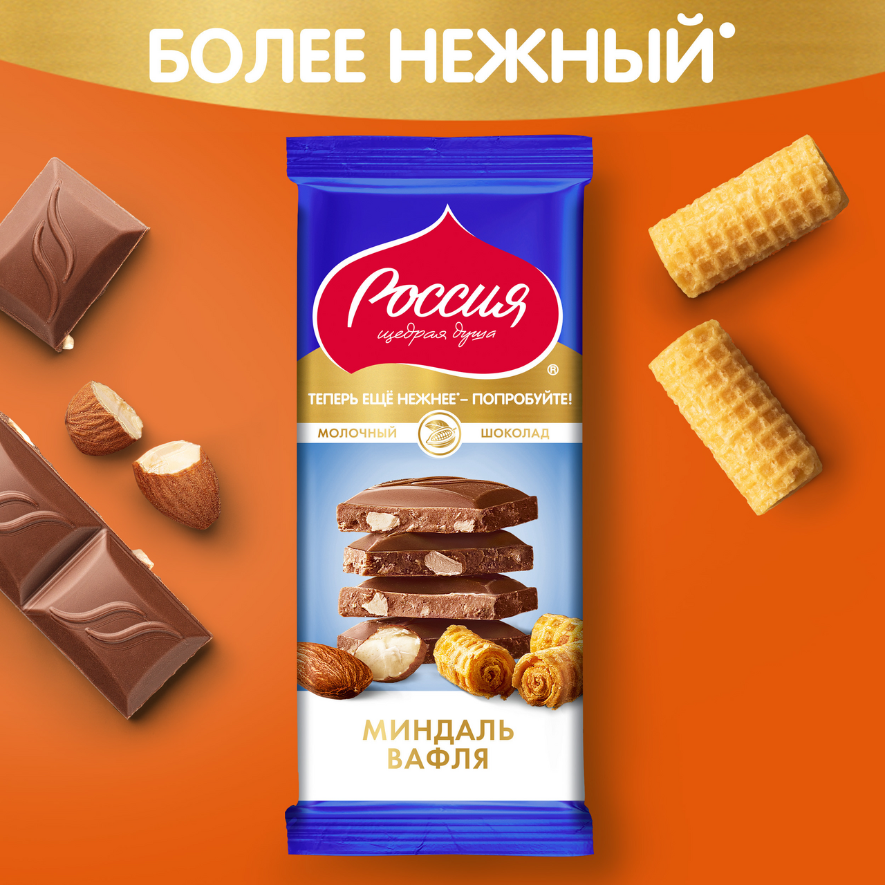 Сложно пройти мимо невероятно популярного сочетания отборного обжаренного миндаля и хрустящей вафли в шоколаде Россия Щедрая душа. Молочный шоколад с миндалём и вафлей. Простое, но невероятно вкусное сочетание нежного молочного вкуса, отборных качественных ингредиентов и аппетитной формы шоколада - обещают сладкое гастрономическое удовольствие, а современный яркий дизайн упаковки порадует ваш взгляд.