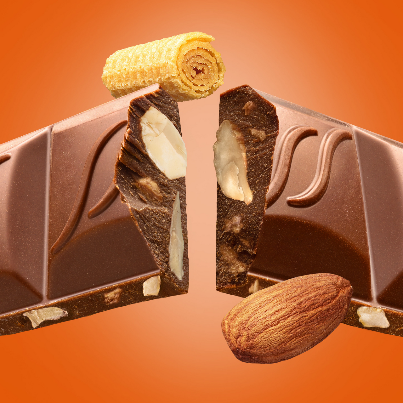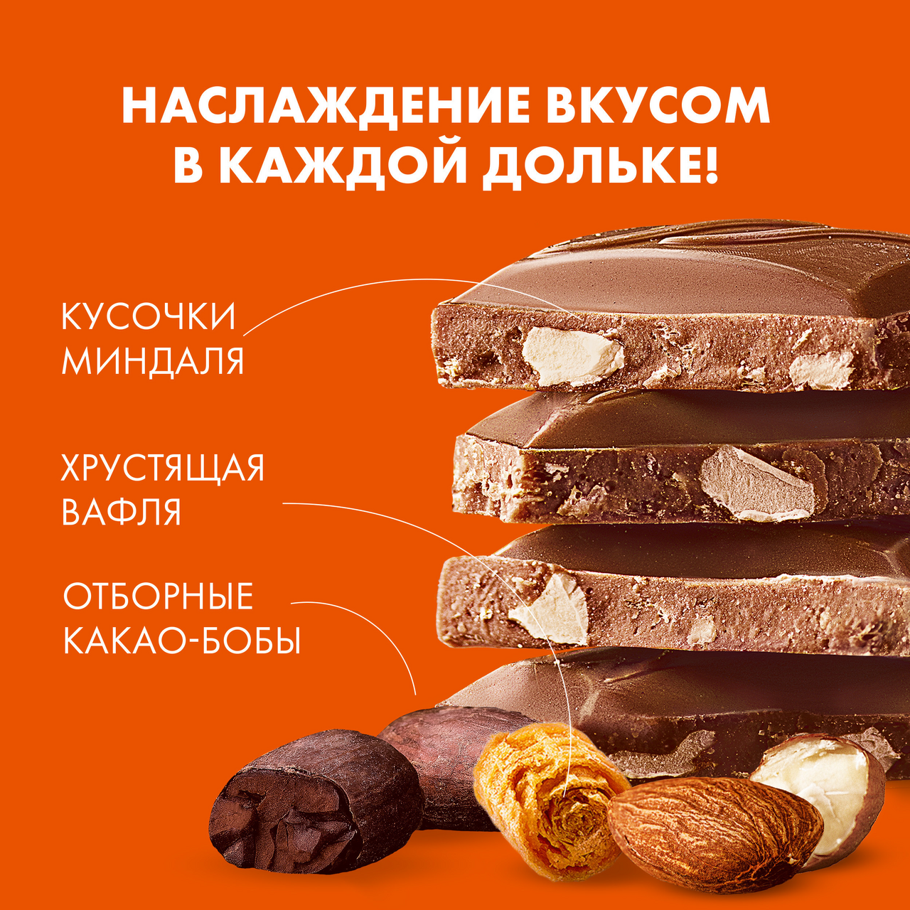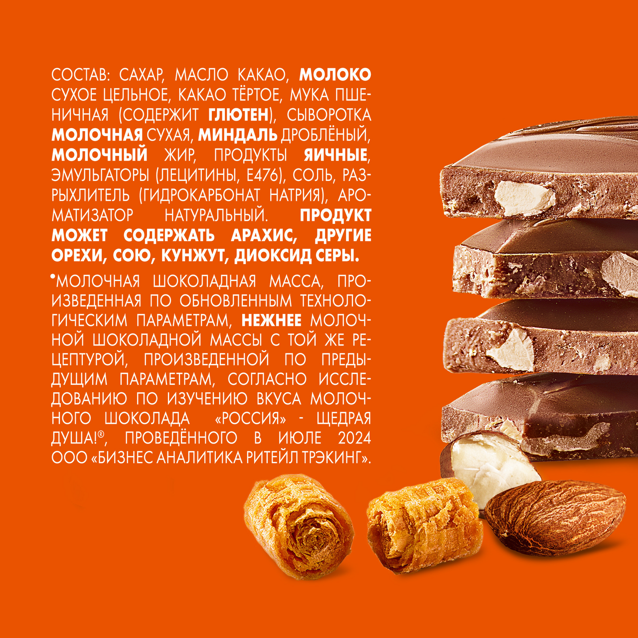 Сахар, масло какао, молоко сухое цельное, какао тертое, вафельная крошка (6,8 %) (мука пшеничная (содержит глютен), продукты яичные, соль, разрыхлитель (гидрокарбонат натрия)), сыворотка молочная сухая, миндаль дробленый (3,1 %), молочный жир, эмульгаторы (лецитины, Е476), ароматизатор натуральный.