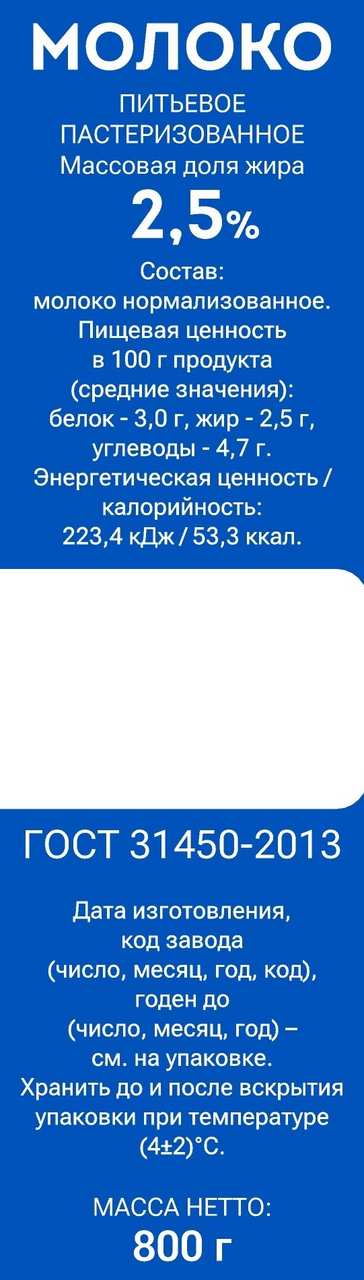Это свежее натуральное молоко высокого качества, поставляемое только с проверенных ферм. На каждом этапе производства, от приемки до выпуска готового продукта в продажу, соблюдаются строгие правила контроля качества.